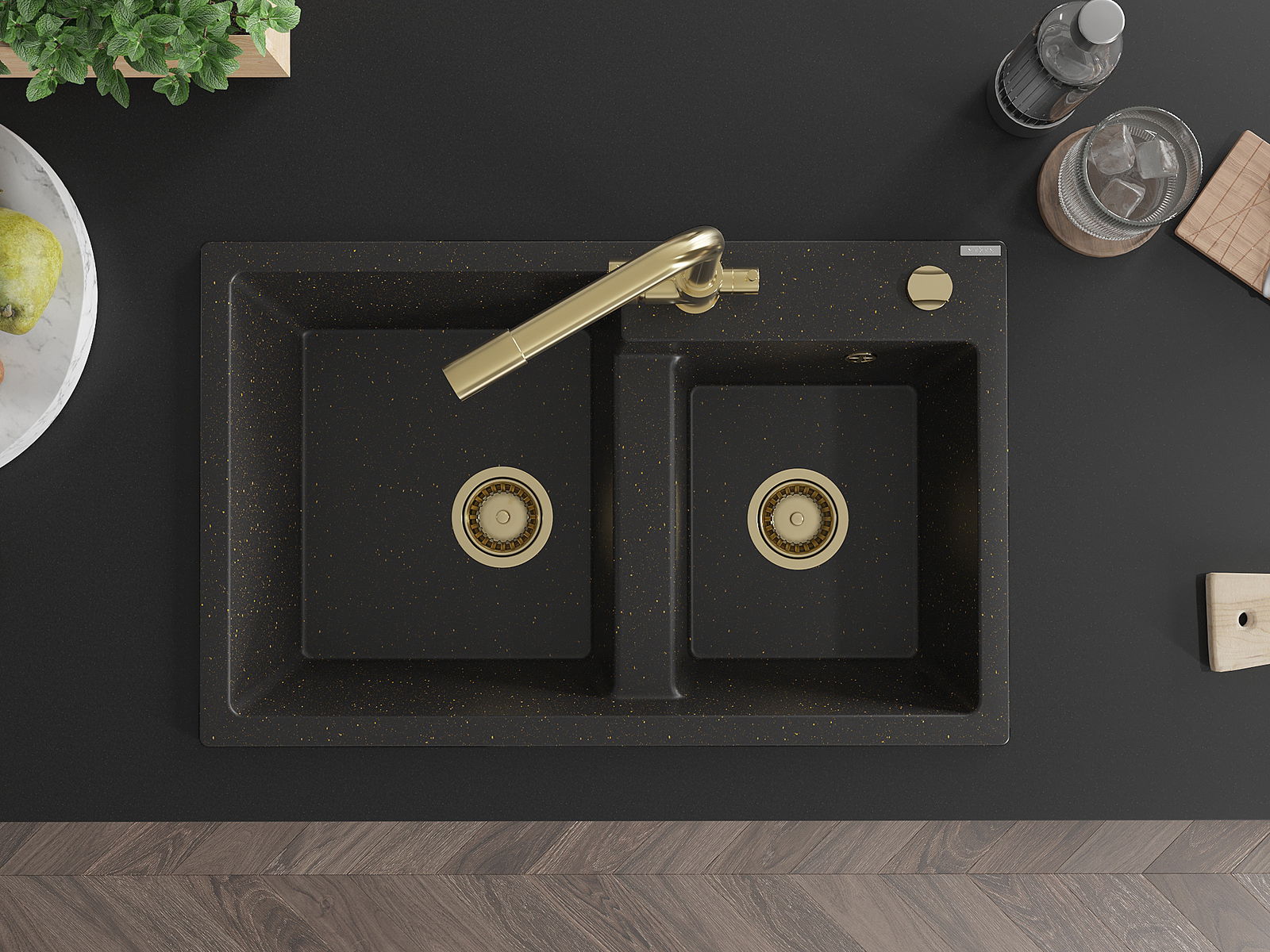 Mexen Tomas évier en granit à 2 bacs avec robinet de cuisine Duero, noir/doré métallique - 6516-75-671600-50