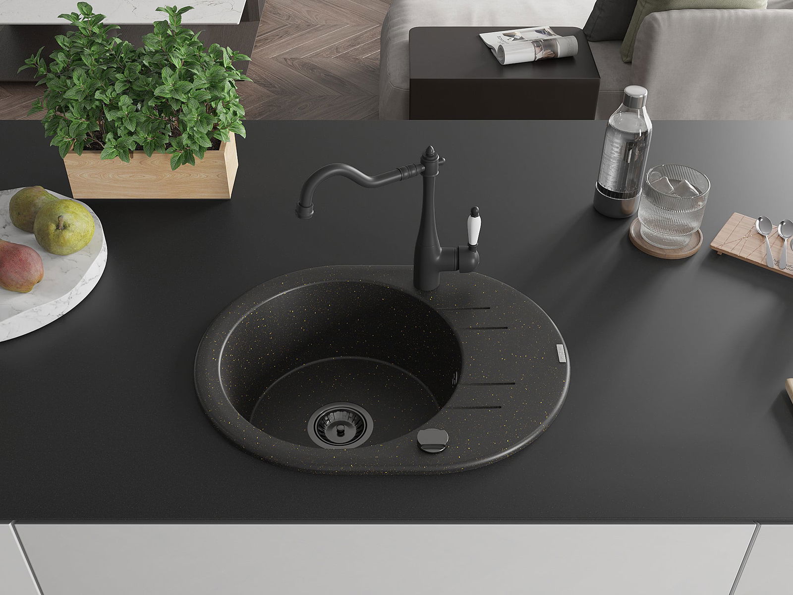 Mexen Kevin évier en granit 1 bac avec égouttoir et robinet de cuisine Carla, noir/métallisé doré - 6517-75-670700-70-B