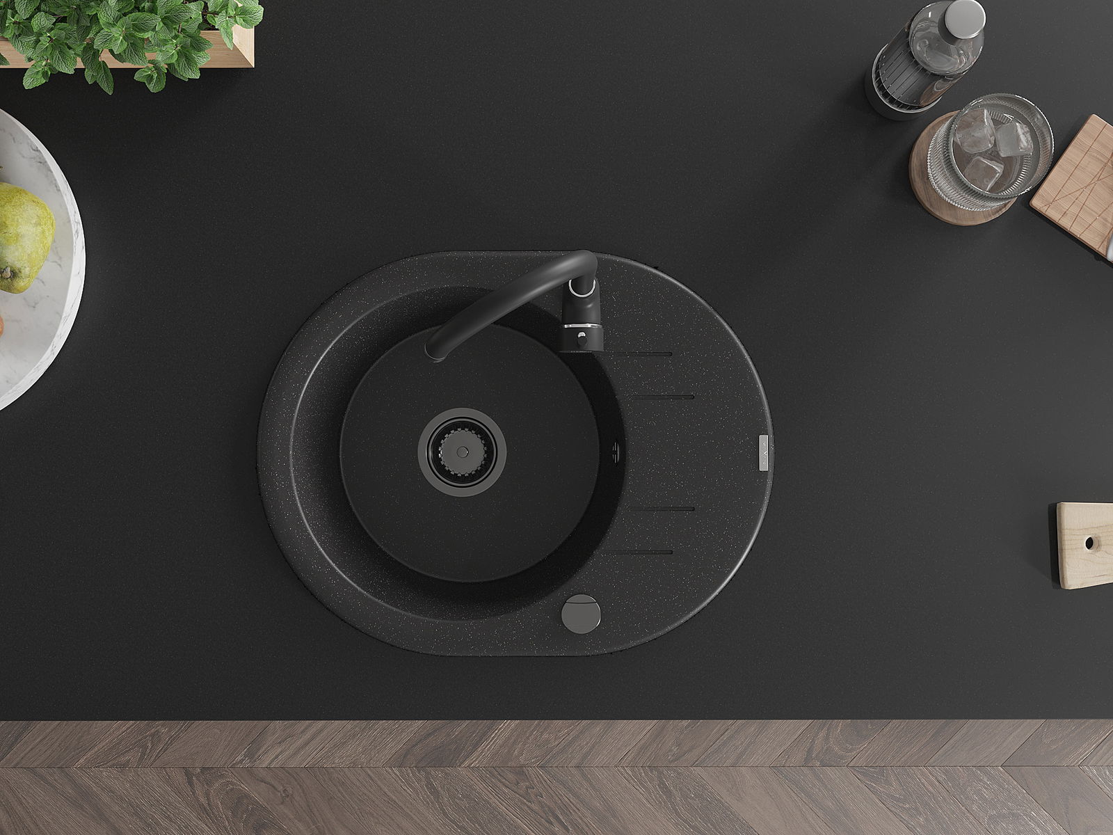Mexen Kevin évier en granit à 1 bac avec égouttoir et robinet de cuisine Telma, noir/argent métallique - 6517-73-670200-70-B