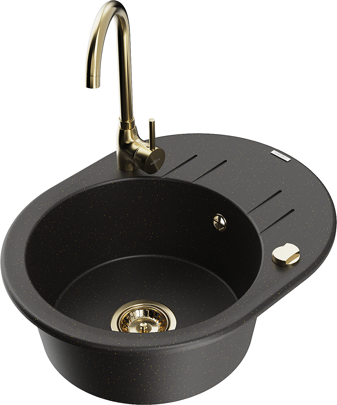 Mexen Kevin évier en granit à 1 bac avec égouttoir et robinet de cuisine Telma, noir/métallique doré - 6517-75-670200-50