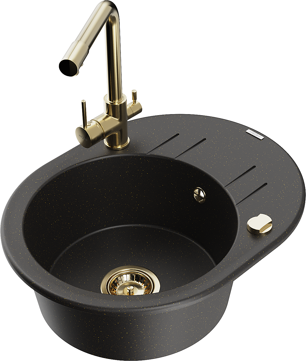 Mexen Kevin évier en granit 1 bac avec égouttoir et robinet de cuisine Duero, noir/or métallisé - 6517-75-671600-50