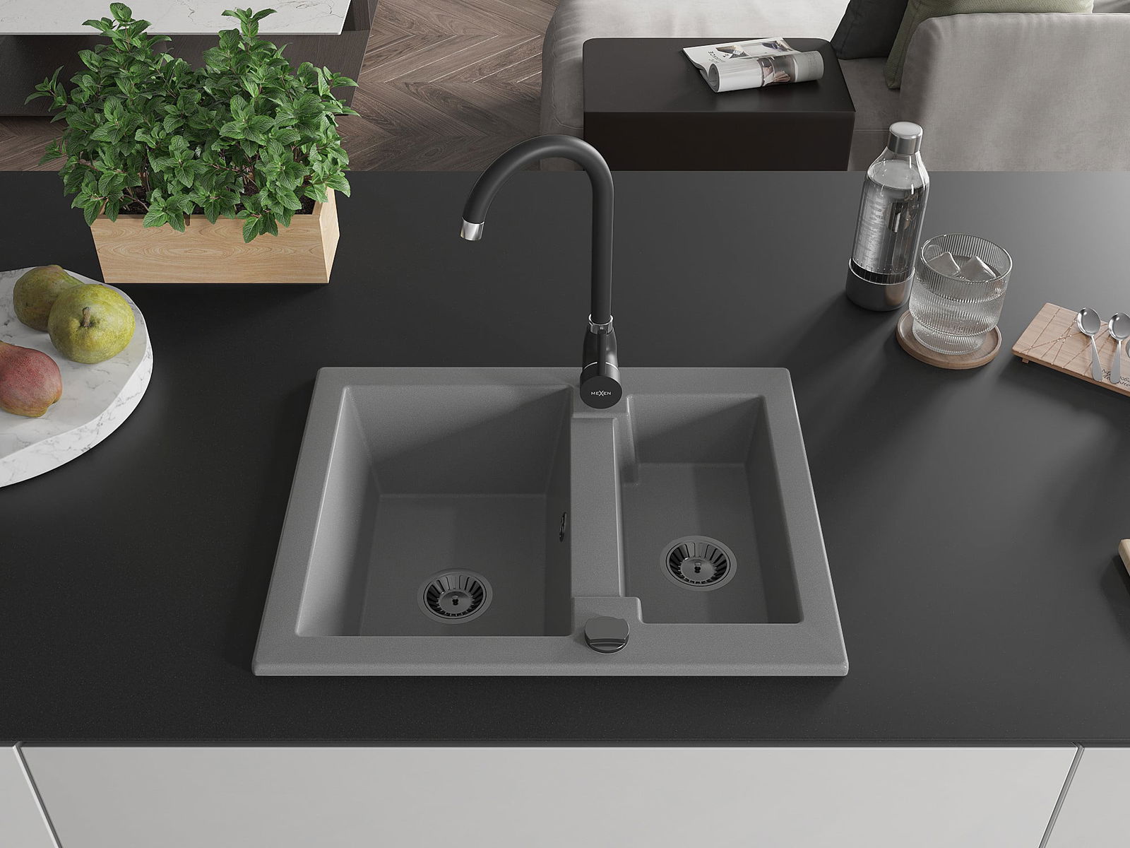 Mexen Carlos évier en granite 1,5 bac avec robinet de cuisine Telma, gris - 6518-71-670200-70-B