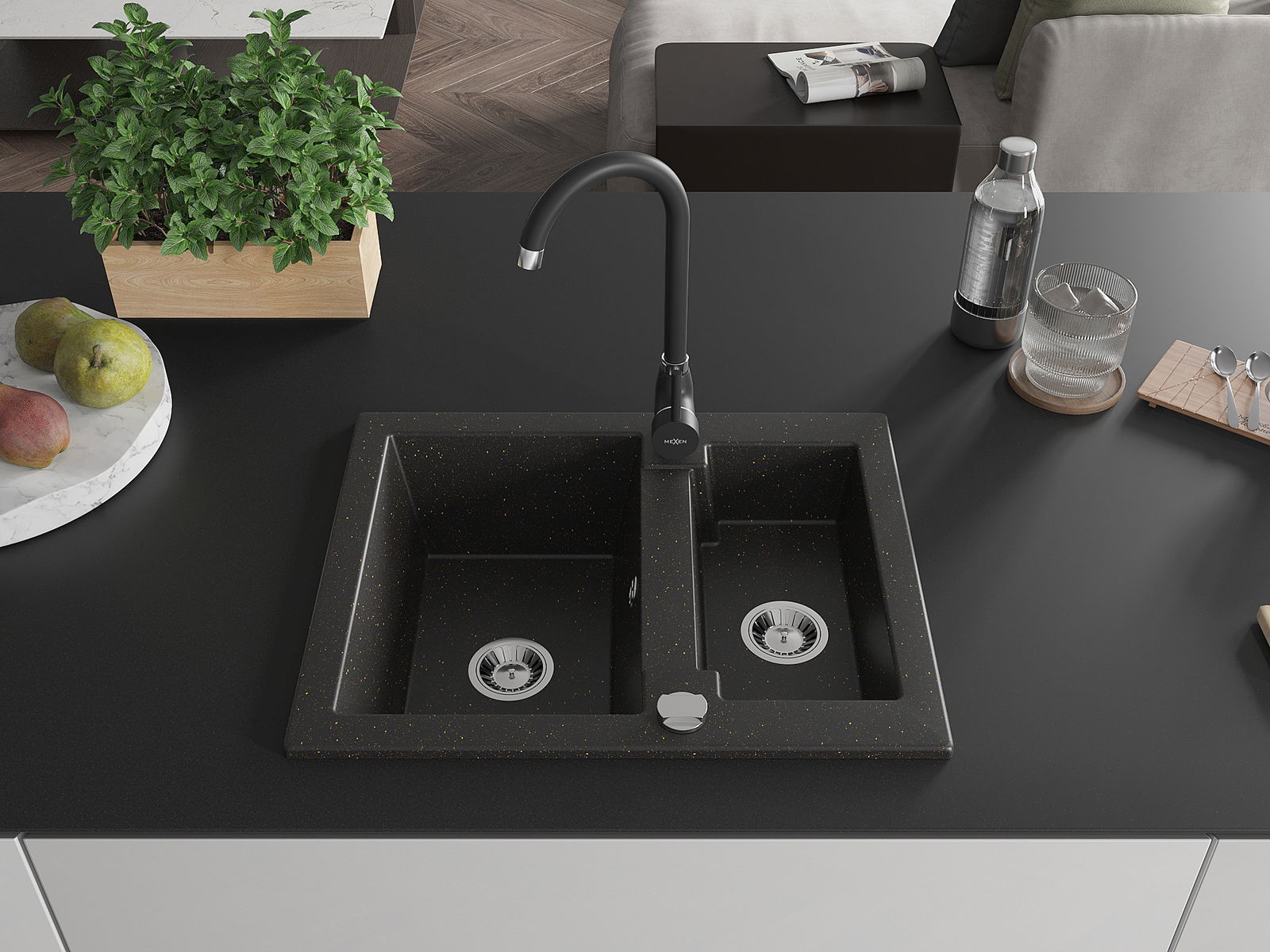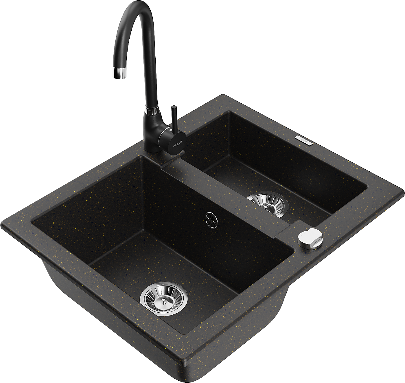 Mexen Carlos évier en granit 1,5 bac avec robinet de cuisine Telma, noir/doré métallique - 6518-75-670200-70
