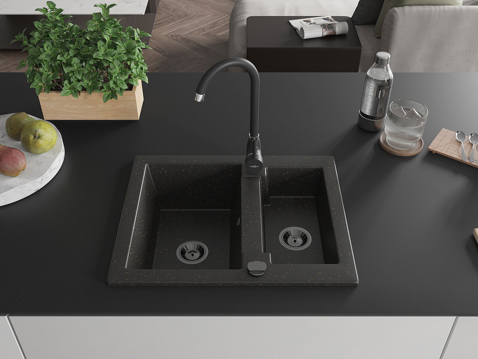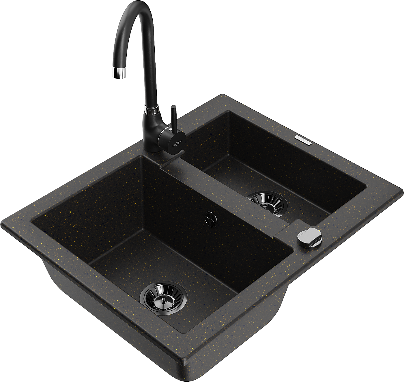 Mexen Carlos évier de cuisine en granit 1,5 bac avec robinet de cuisine Telma, noir/or métallique - 6518-75-670200-70-B