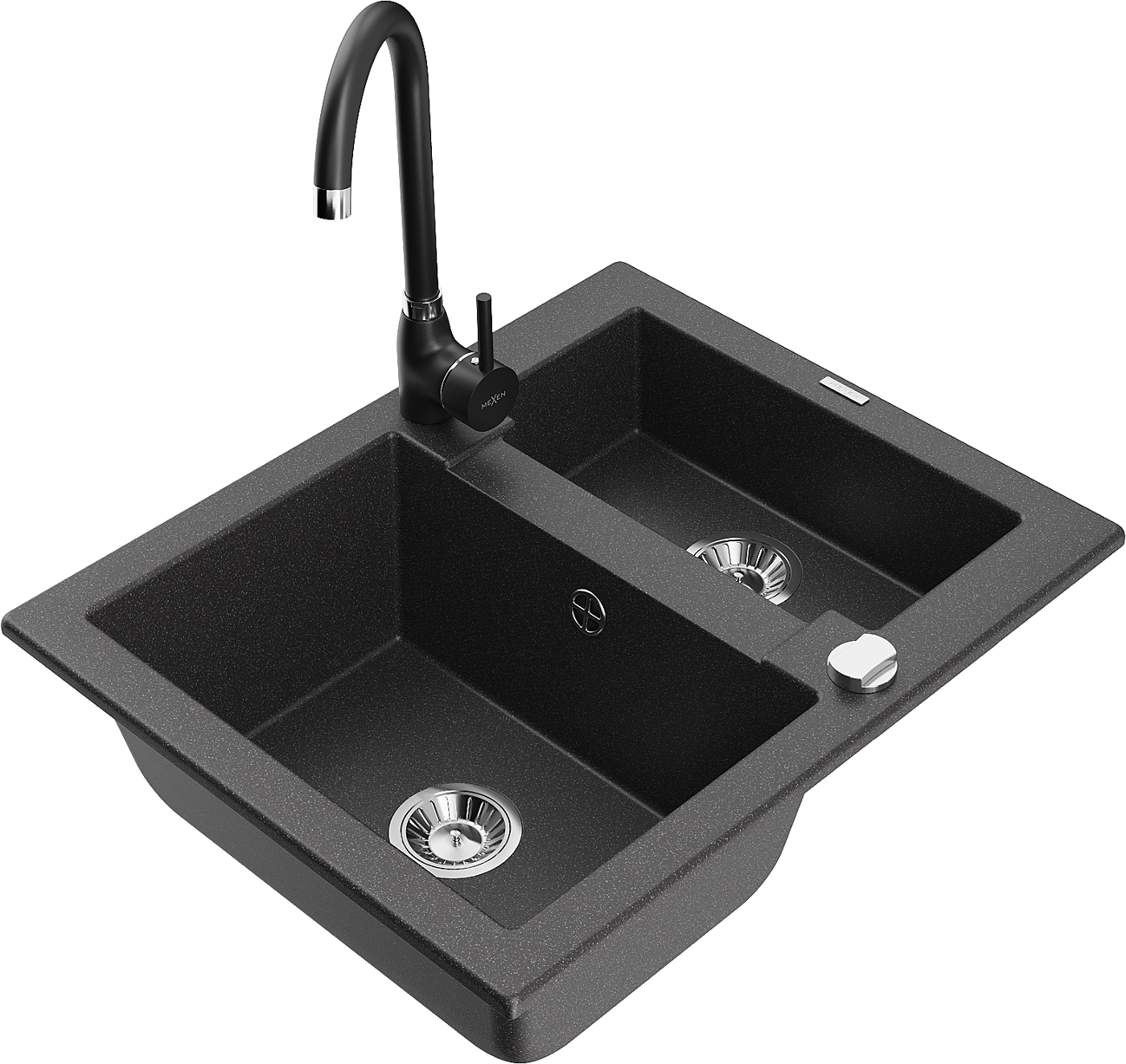 Mexen Carlos évier en granit 1,5 bac avec robinet de cuisine Telma, noir moucheté - 6518-76-670200-70