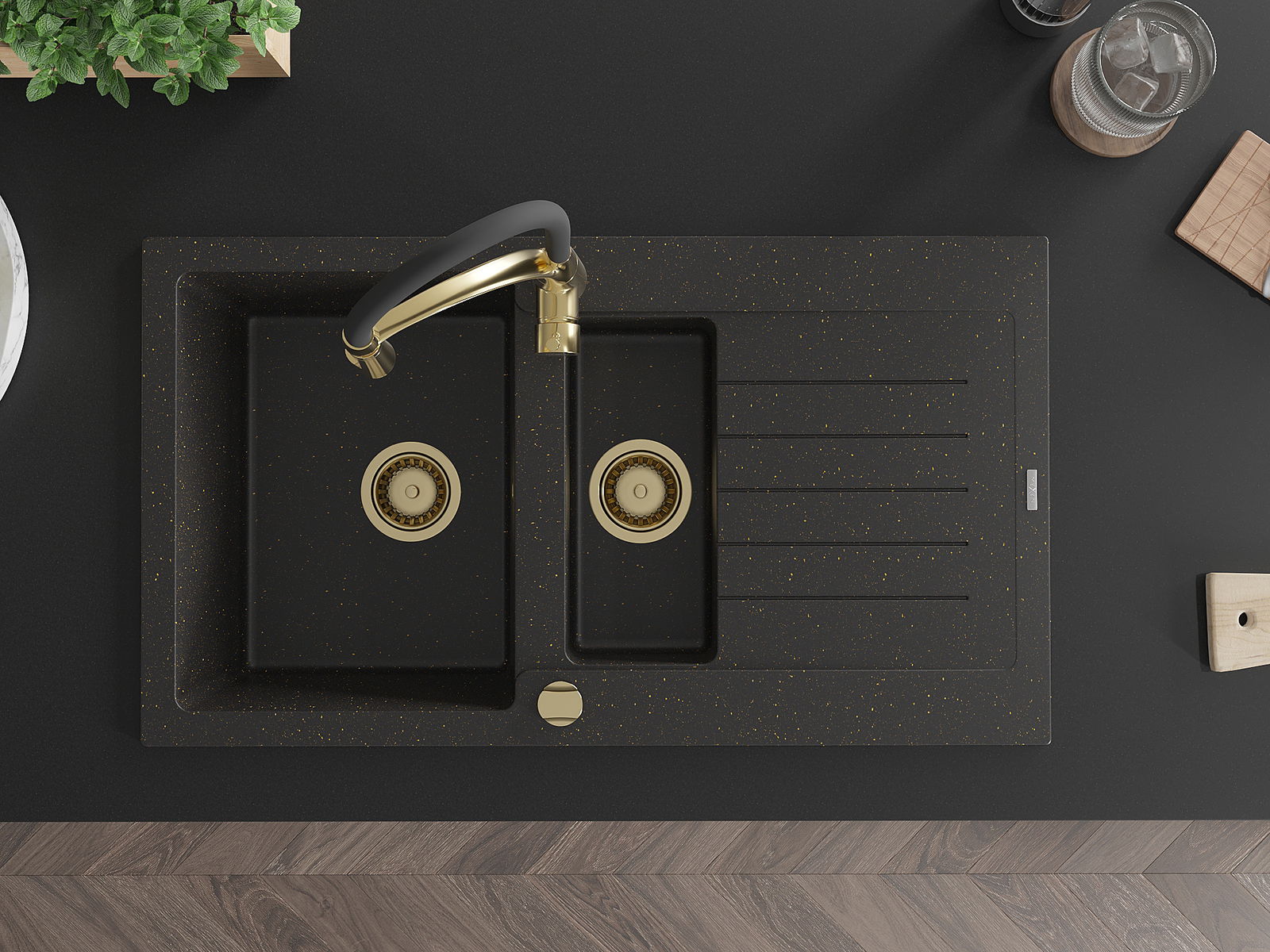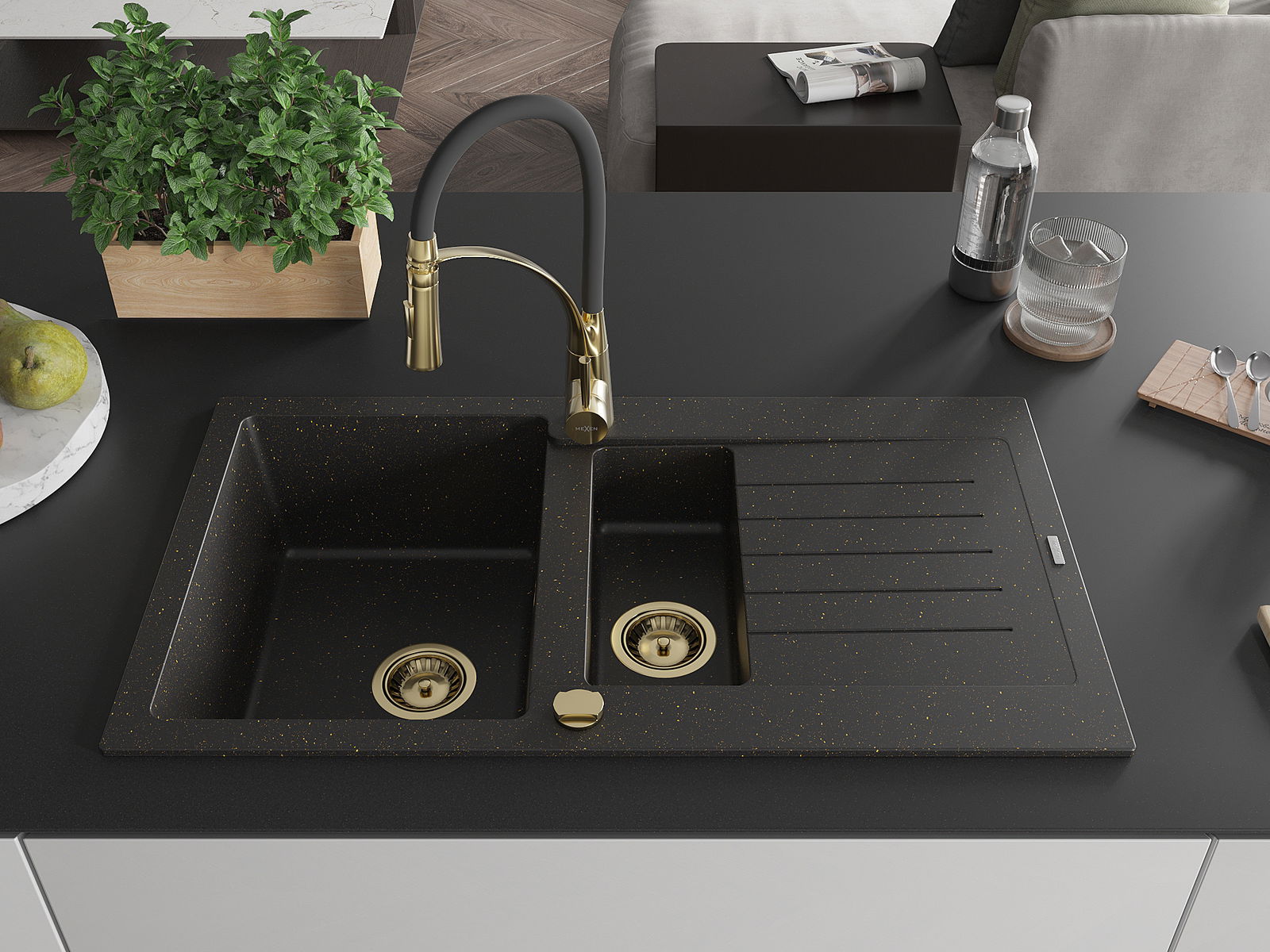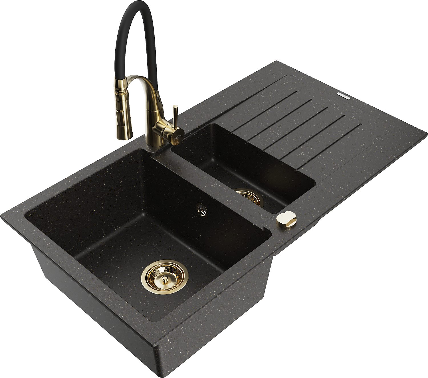 Mexen Matias évier en granit 1,5 bac avec égouttoir et robinet de cuisine Aster, noir/doré métallisé - 6502-75-73450-57-G