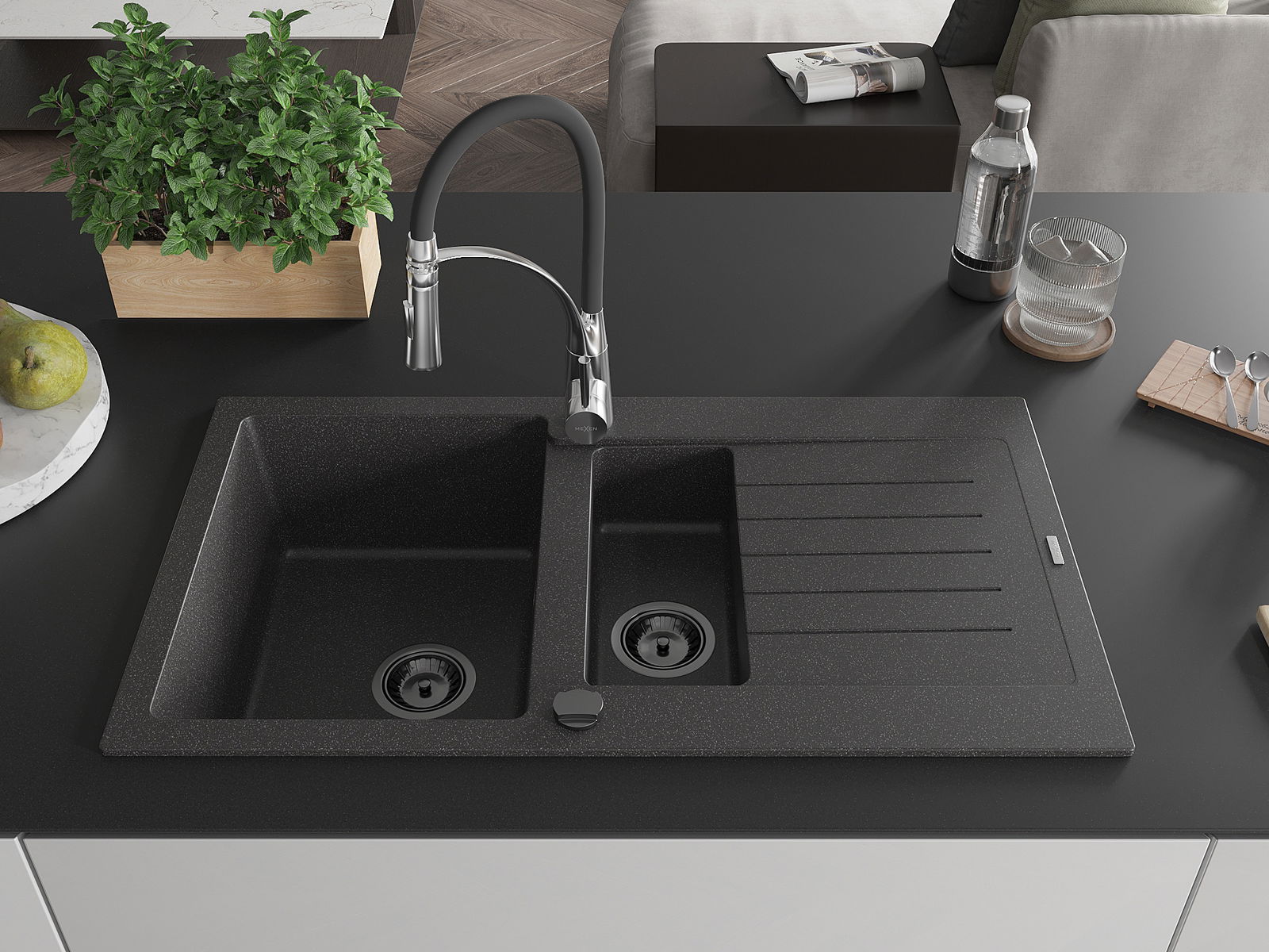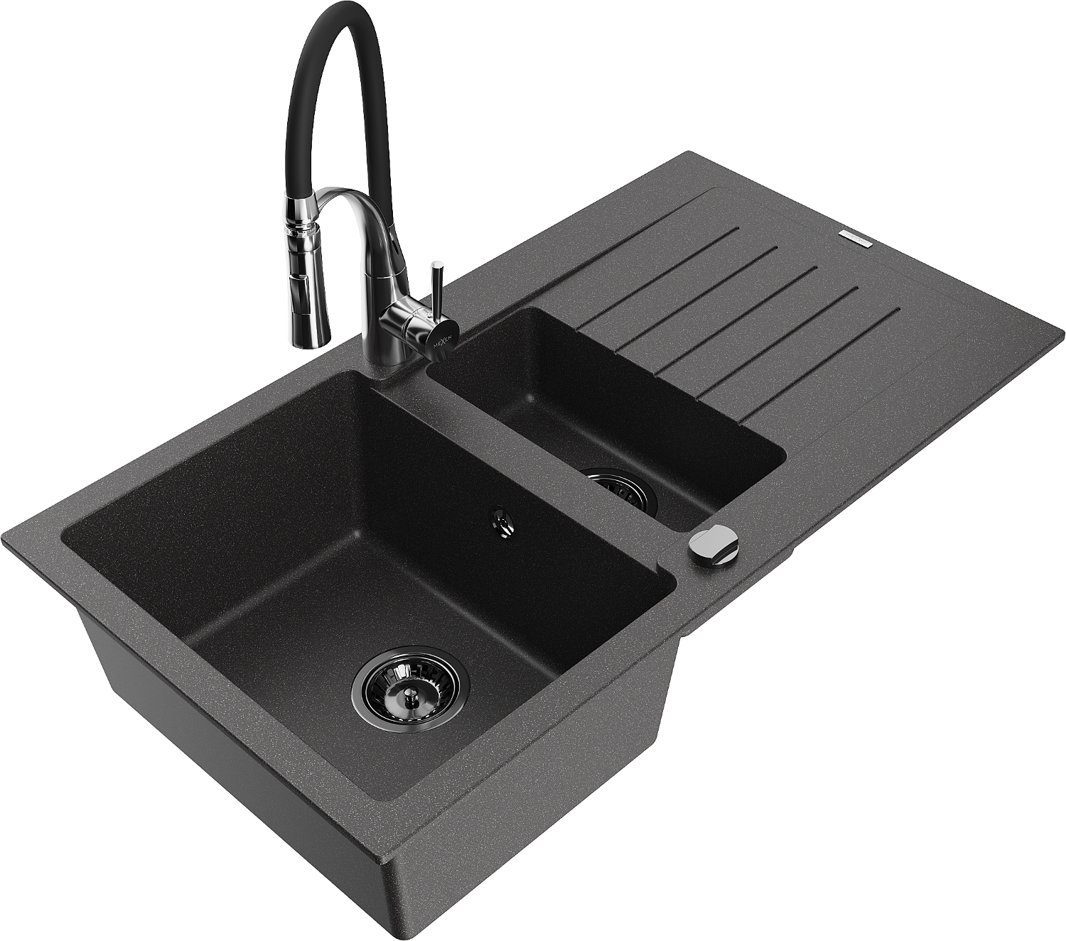 Mexen Matias évier en granit à 1,5 bac avec égouttoir et robinet de cuisine Aster, noir moucheté - 6502-76-73450-07-B