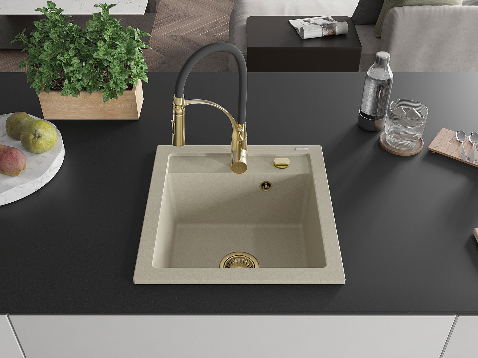 L'évier a un trou sous-meulé de 35 mm de diamètre à percer soi-même. Il peut être utilisé, entre autres, pour installer un distributeur de liquide, ce qui éliminera la présence de bouteilles en plastique dans la cuisine et lui donnera une finition élégante.