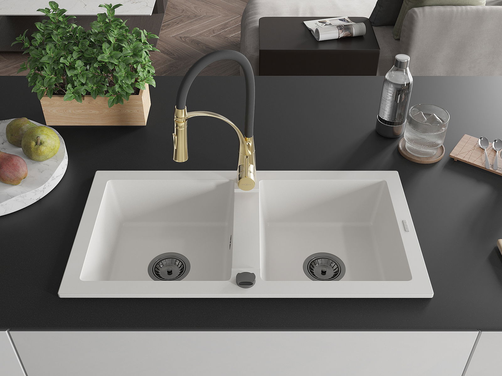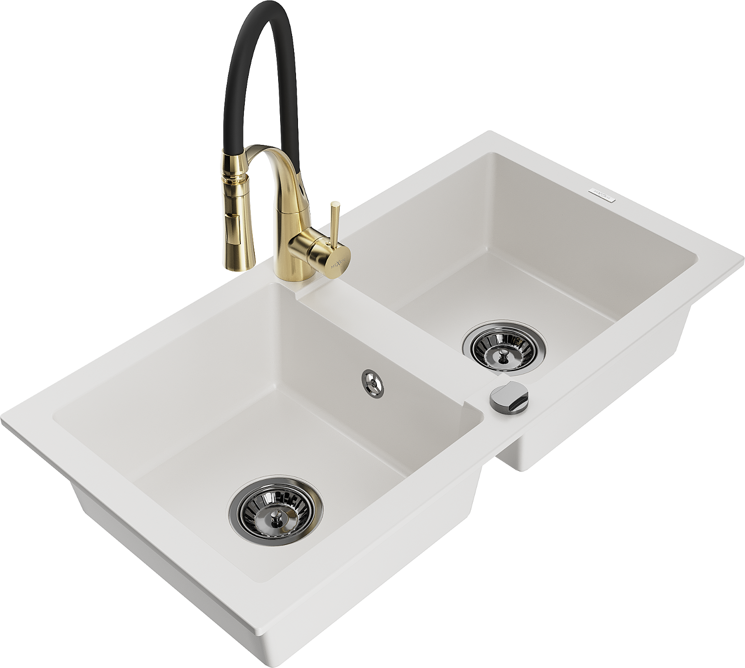 Mexen Mario évier de cuisine en granit à 2 cuves avec robinet de cuisine Aster, blanc - 6504-20-73450-57-B