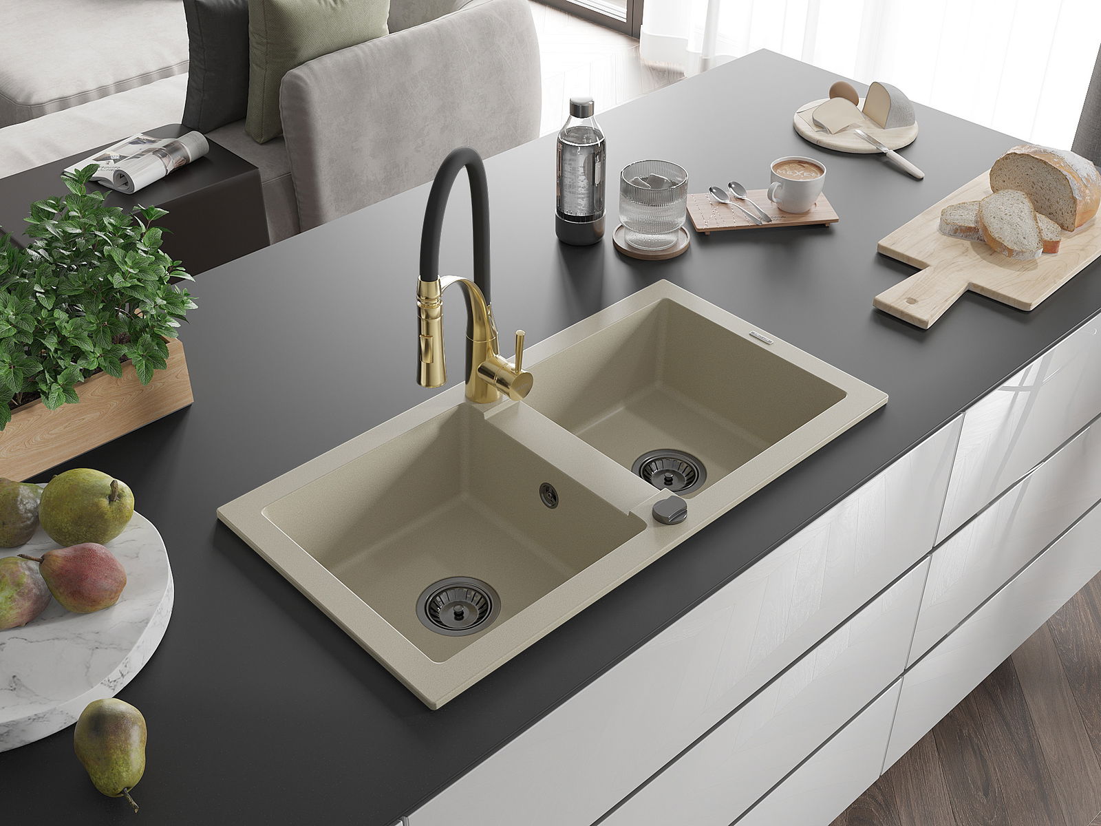 Mexen Mario évier en granit 2 bacs avec mitigeur de cuisine Aster, beige - 6504-69-73450-57-B