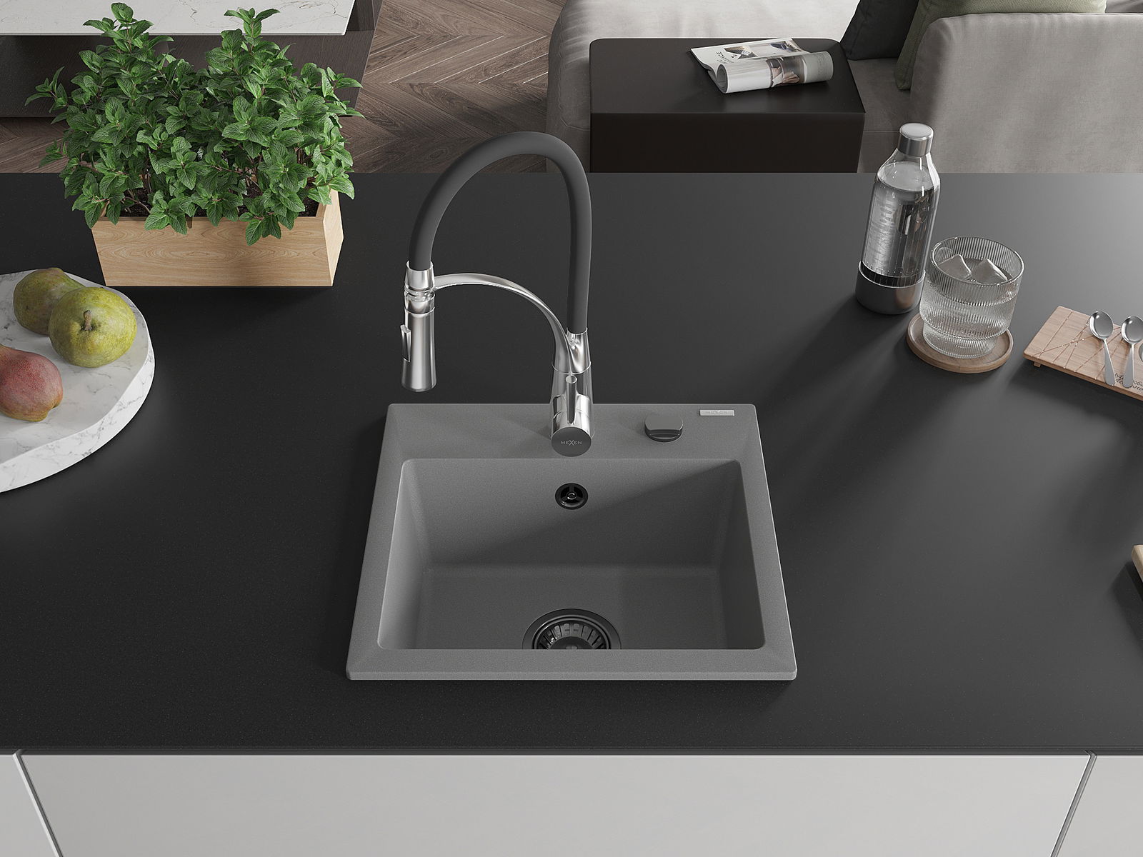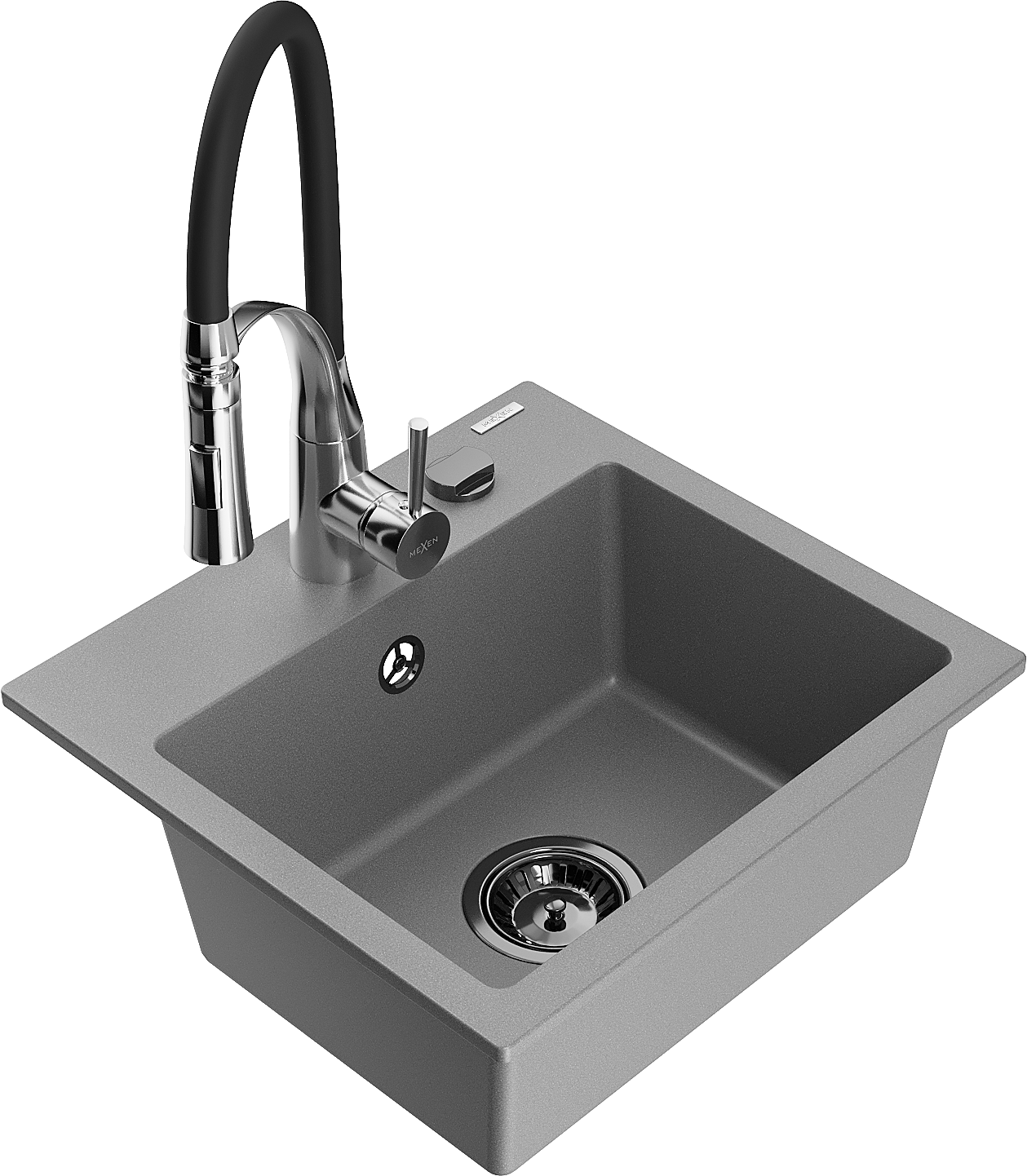 Mexen Milo évier en granit 1 bac avec robinet de cuisine Aster, gris - 6505-71-73450-07-B