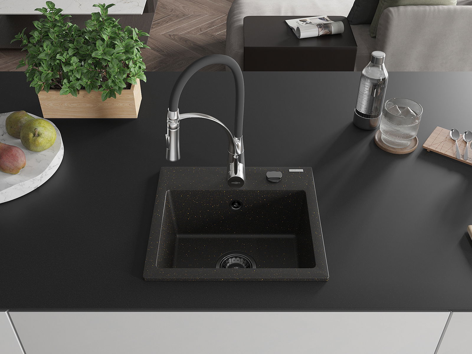 Mexen Milo évier en granit 1 bac avec robinet de cuisine Aster, noir/or métallisé - 6505-75-73450-07-B