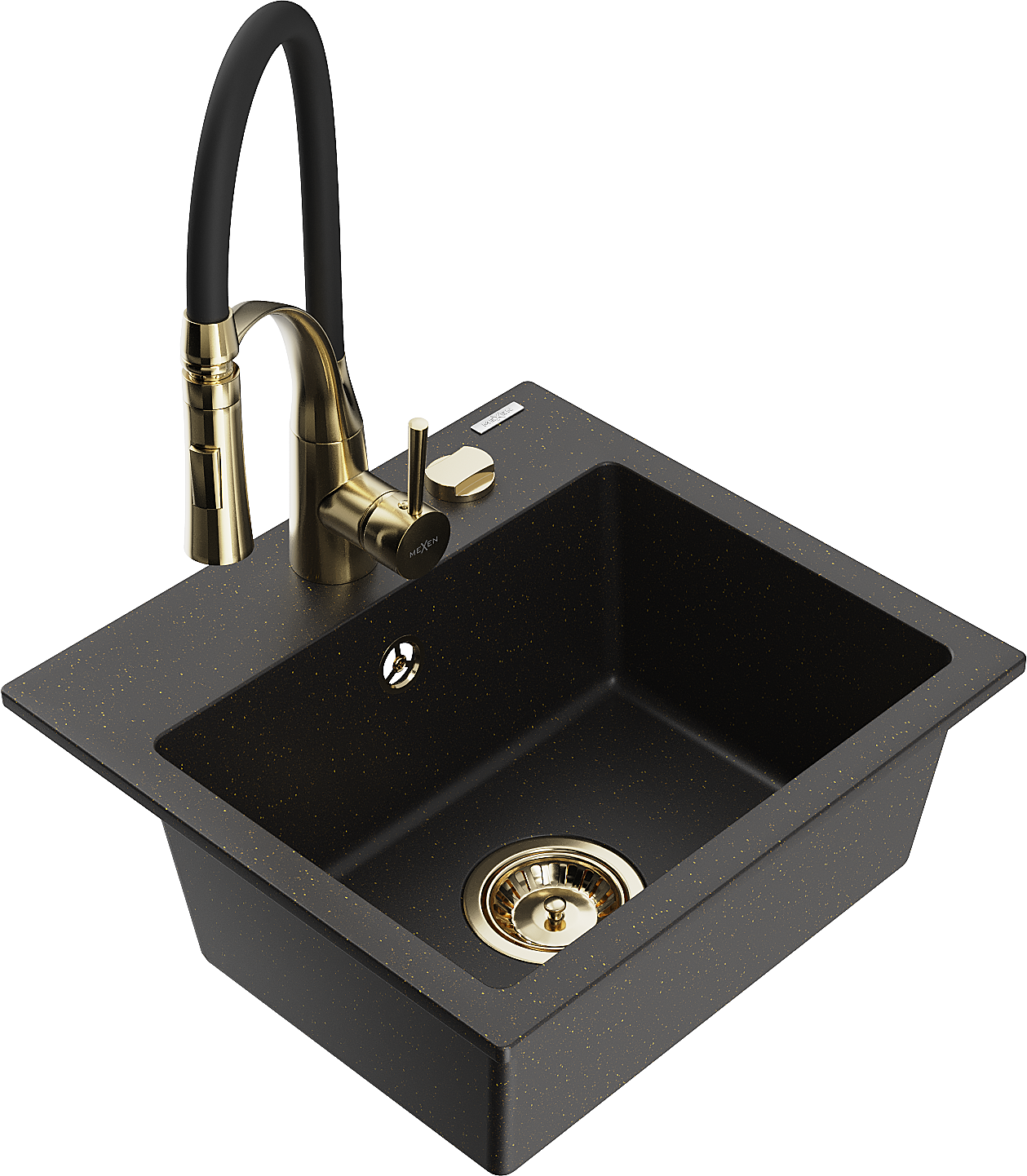 Mexen Milo évier en granit 1 bac avec robinet de cuisine Aster, noir/or métallisé - 6505-75-73450-57-G