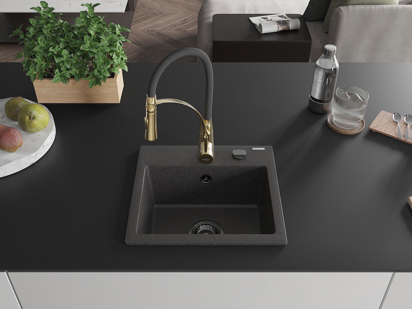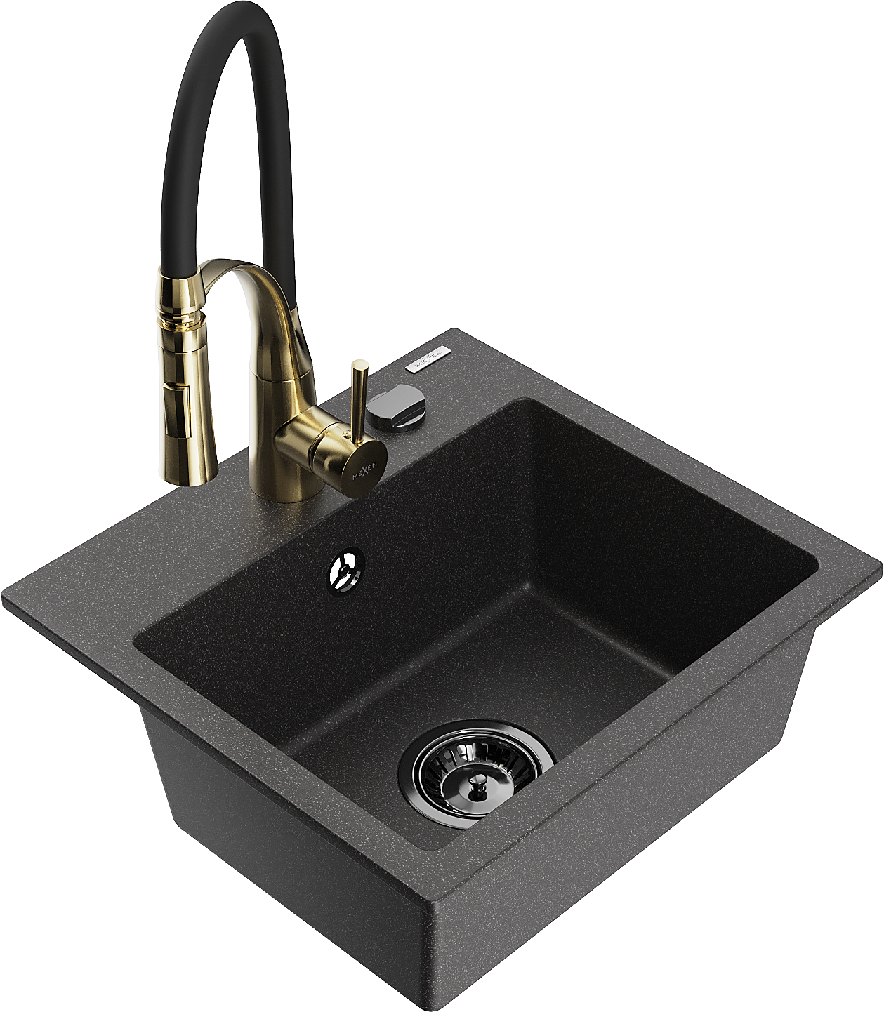Mexen Milo évier en granit 1 bac avec robinet de cuisine Aster, noir moucheté - 6505-76-73450-57-B