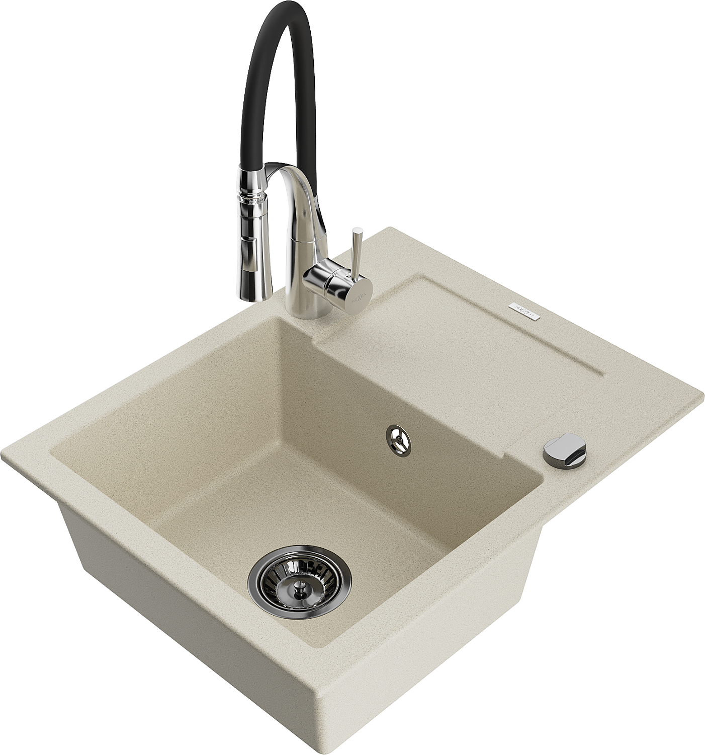 Mexen Enzo évier en granit 1 bac avec égouttoir et robinet de cuisine Aster, beige - 6506-69-73450-07-B