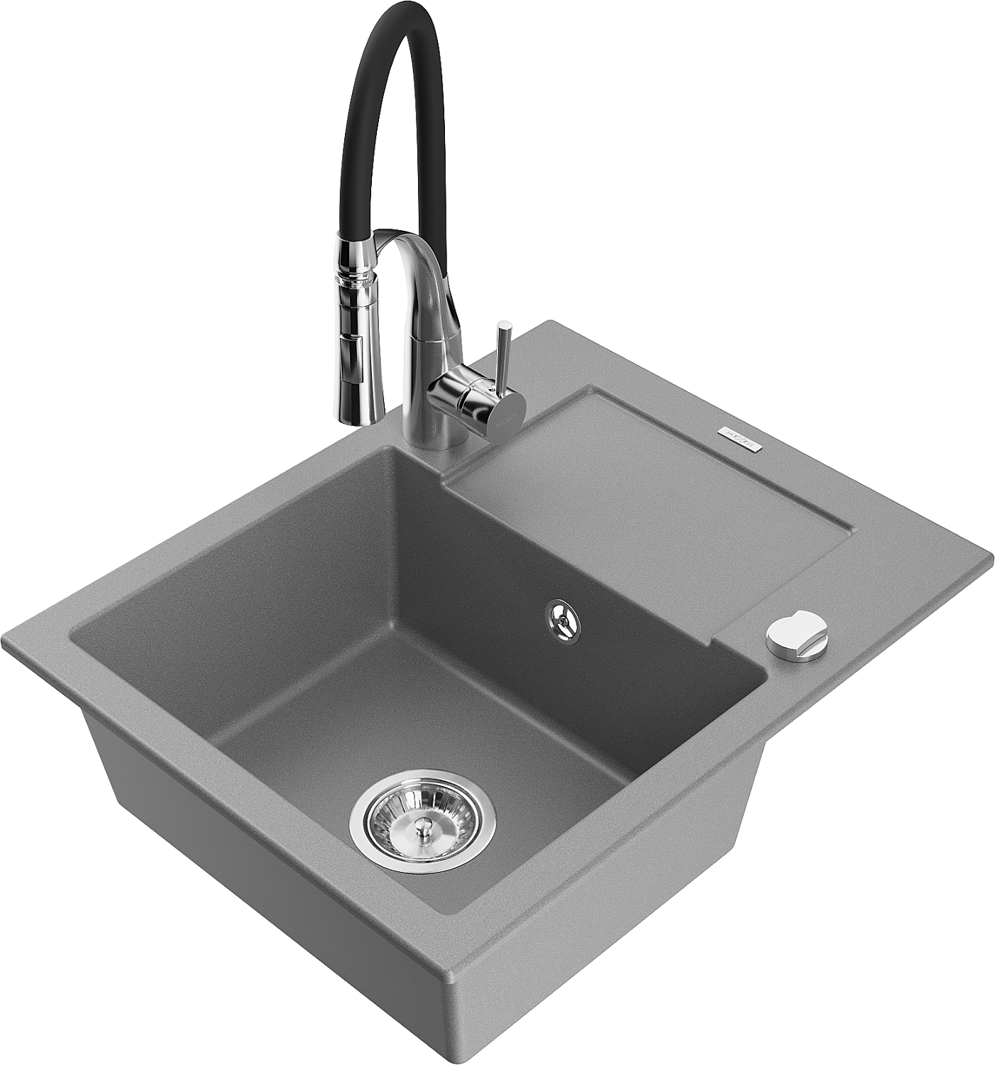 Mexen Enzo évier en granit 1 bac avec égouttoir et mitigeur de cuisine Aster, gris - 6506-71-73450-07