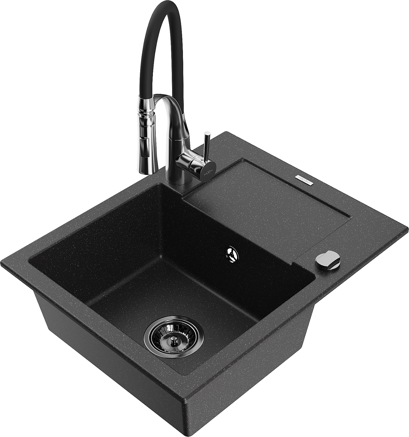 Mexen Enzo évier en granit à 1 bac avec égouttoir et robinet de cuisine Aster, noir/métallisé argent - 6506-73-73450-07-B