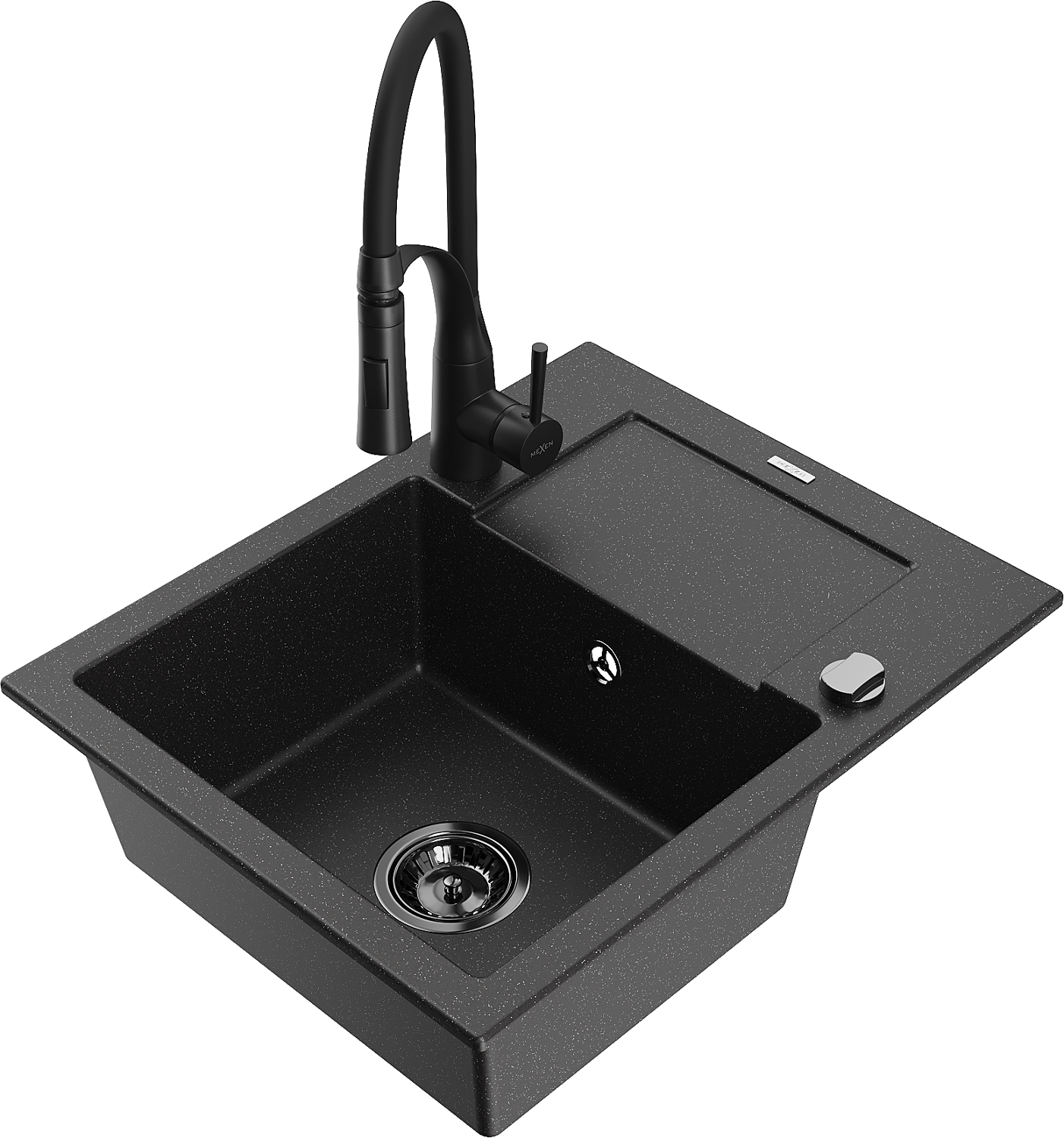 Mexen Enzo évier en granit à 1 bac avec égouttoir et robinet de cuisine Aster, noir/métallisé argenté - 6506-73-73450-70-B