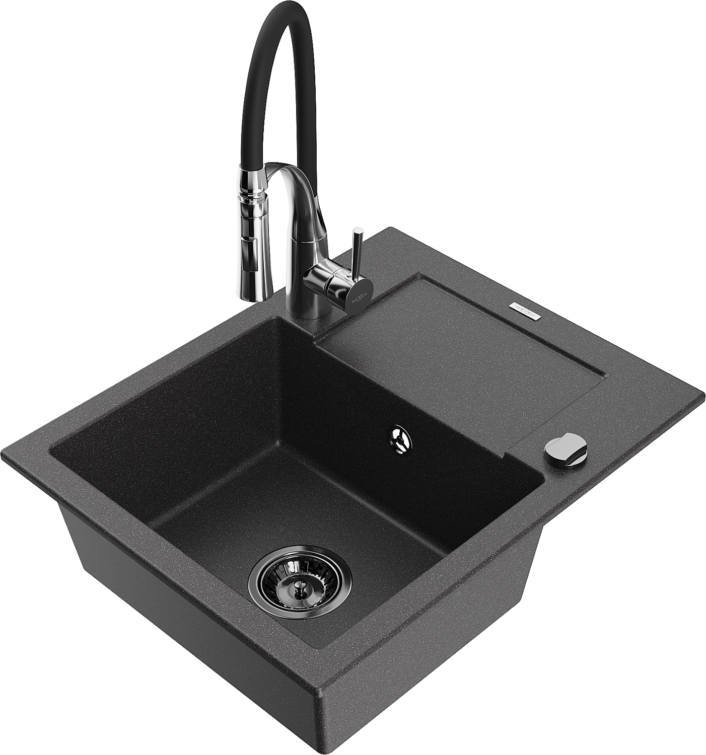 Mexen Enzo évier en granit 1 bac avec égouttoir et robinet de cuisine Aster, noir moucheté - 6506-76-73450-07-B