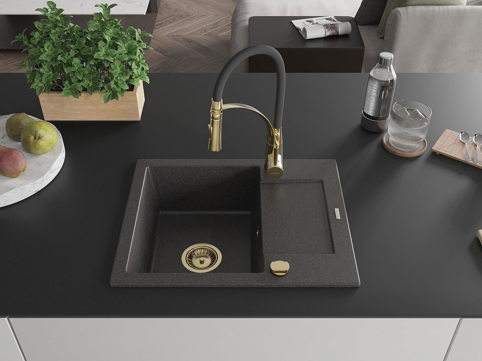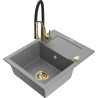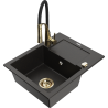 Mexen Enzo évier en granit 1 bac avec égouttoir et robinet de cuisine Aster, noir moucheté - 6506-76-73450-57-G