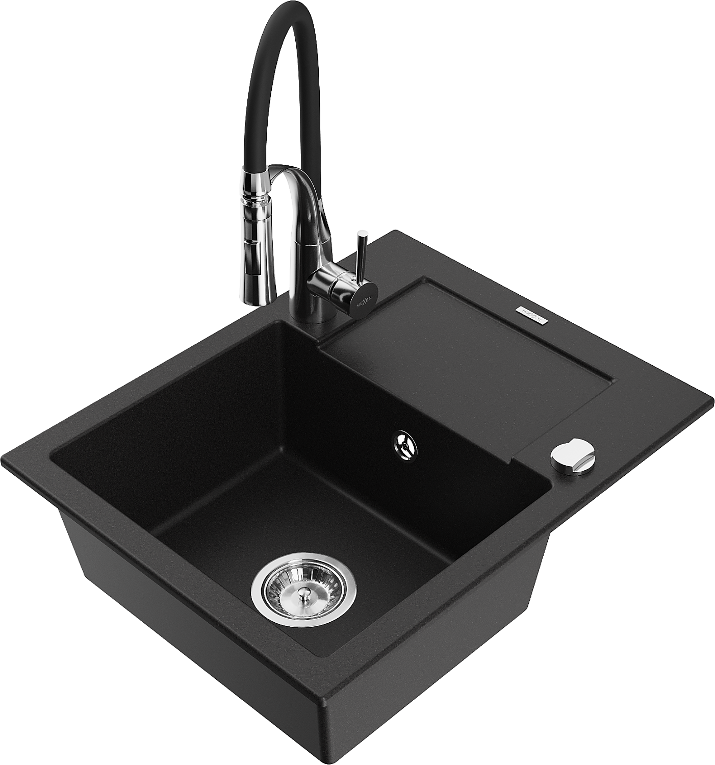 Mexen Enzo évier en granit 1 bac avec égouttoir et mitigeur de cuisine Aster, noir - 6506-77-73450-07
