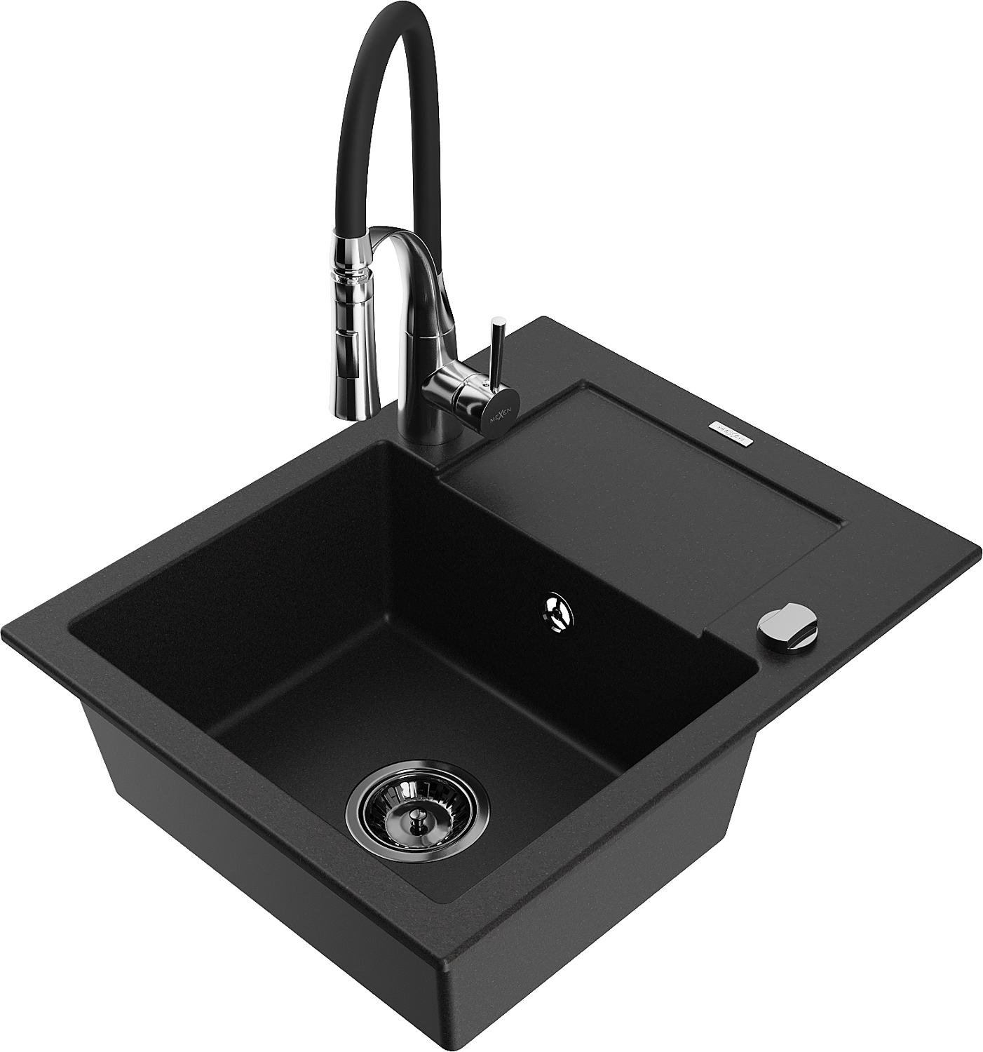 Mexen Enzo évier en granit 1 bac avec égouttoir et mitigeur de cuisine Aster, noir - 6506-77-73450-07-B