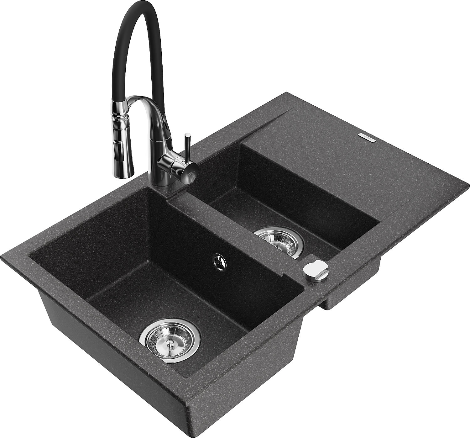 Mexen Gaspar évier en granit 1,5 bac avec égouttoir et robinet de cuisine Aster, noir moucheté - 6507-76-73450-07