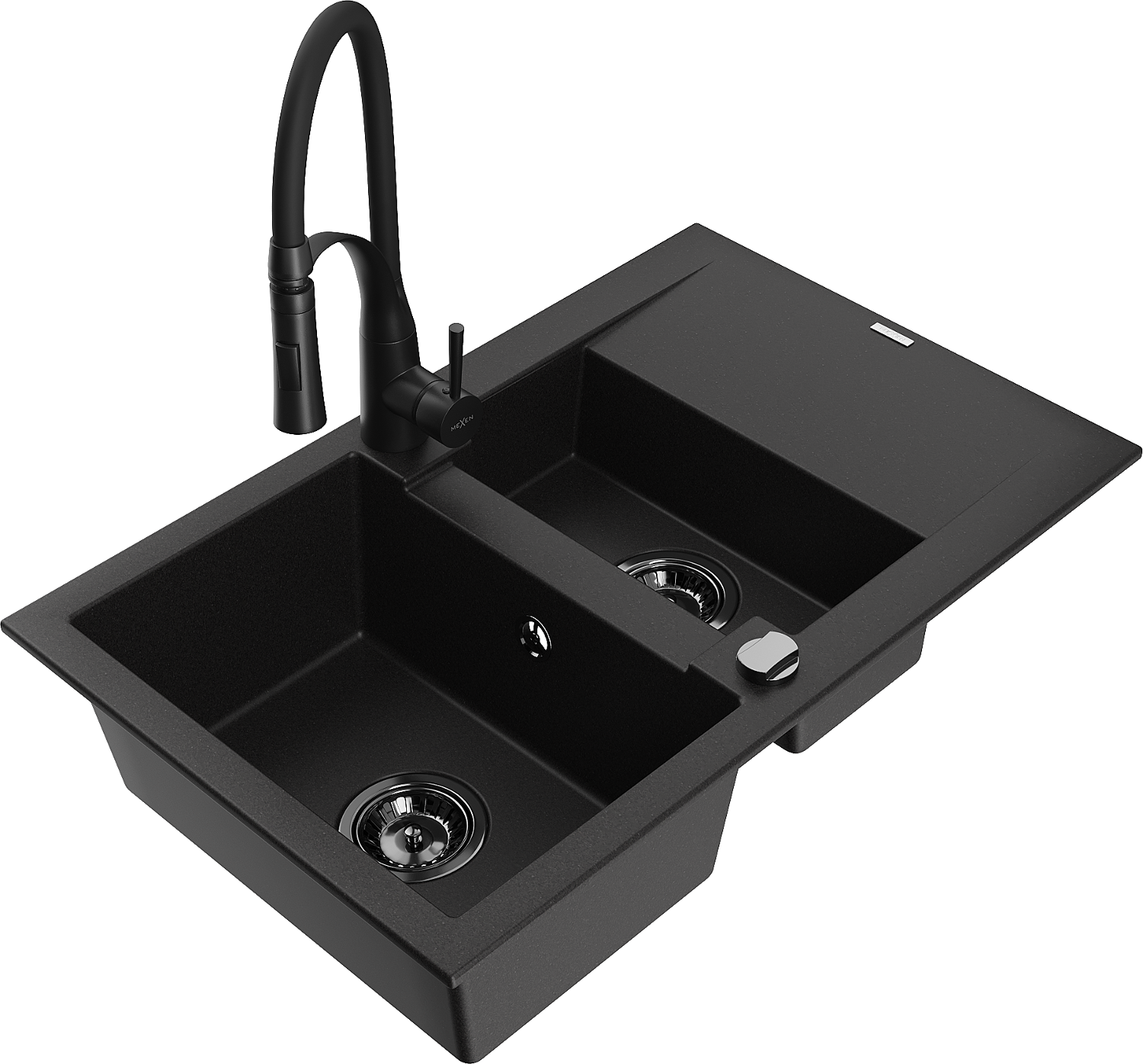 Mexen Gaspar évier en granit 1,5 bac avec égouttoir et robinet de cuisine Aster, noir - 6507-77-73450-70-B