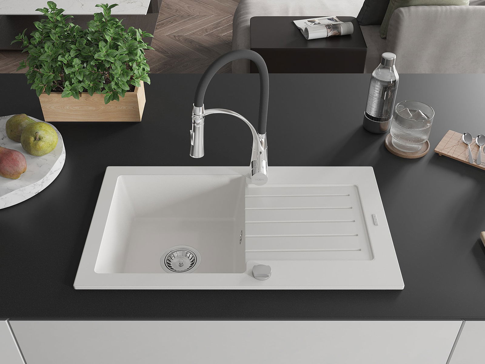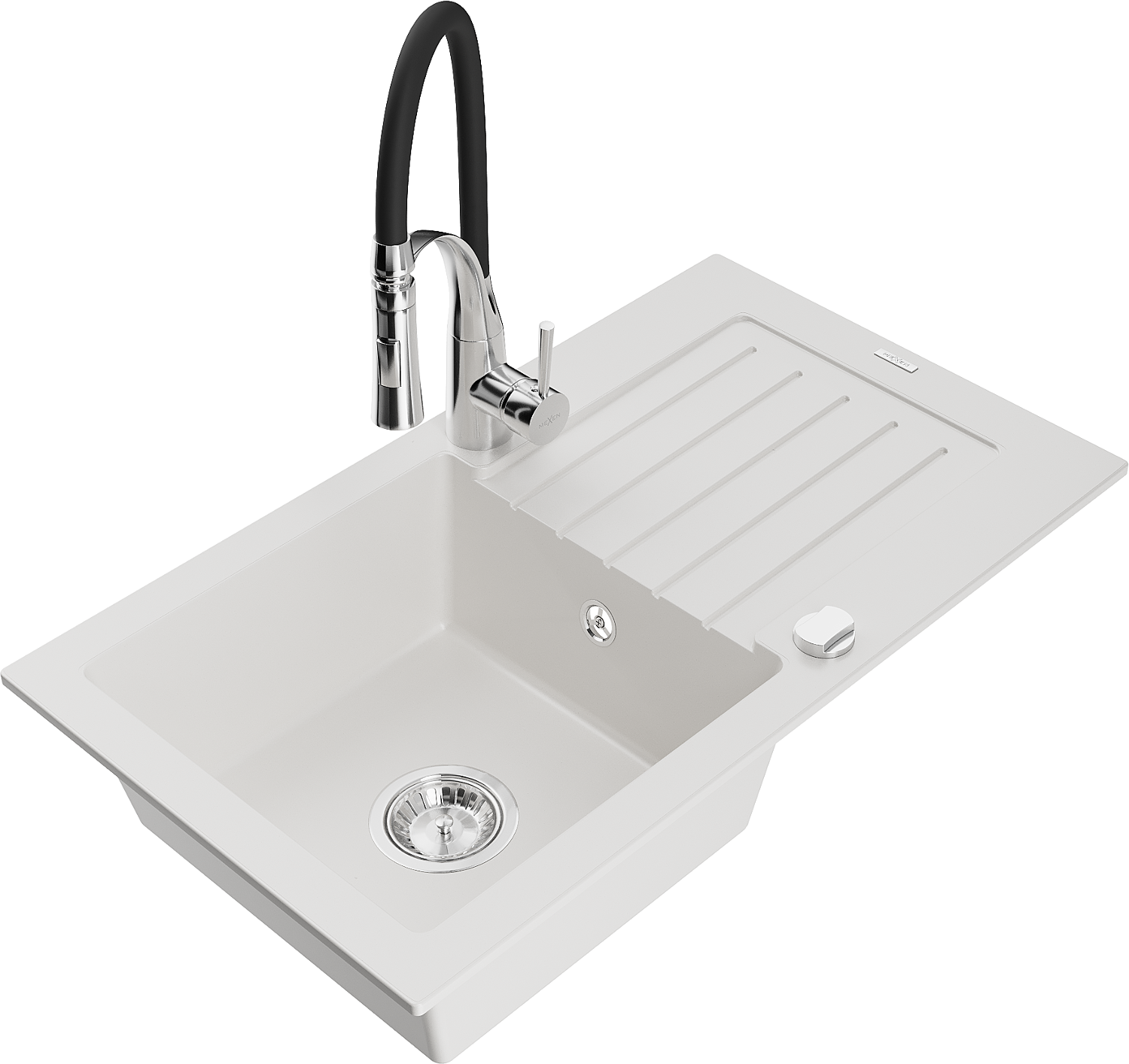 Mexen Pablo évier en granit 1 bac avec égouttoir et robinet de cuisine Aster, blanc - 6510-20-73450-07