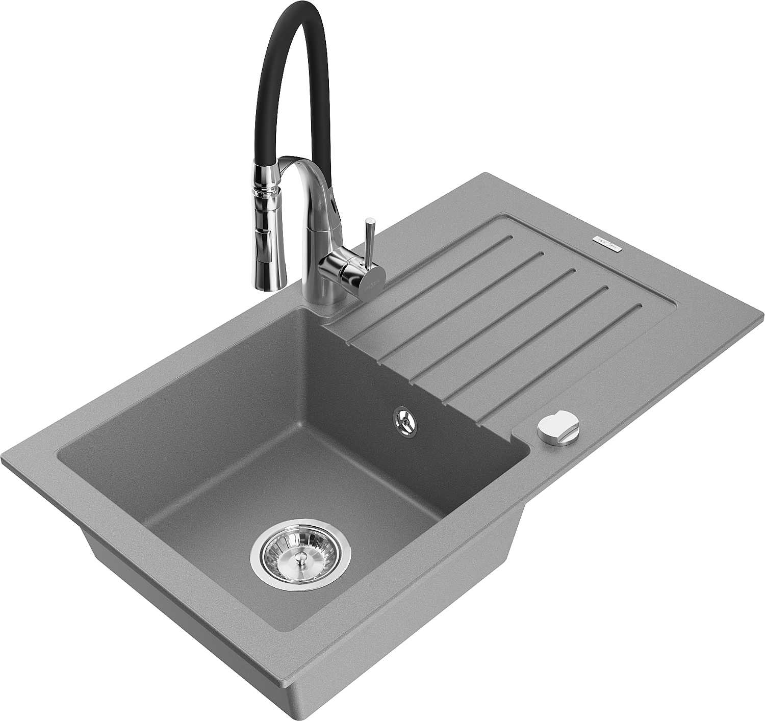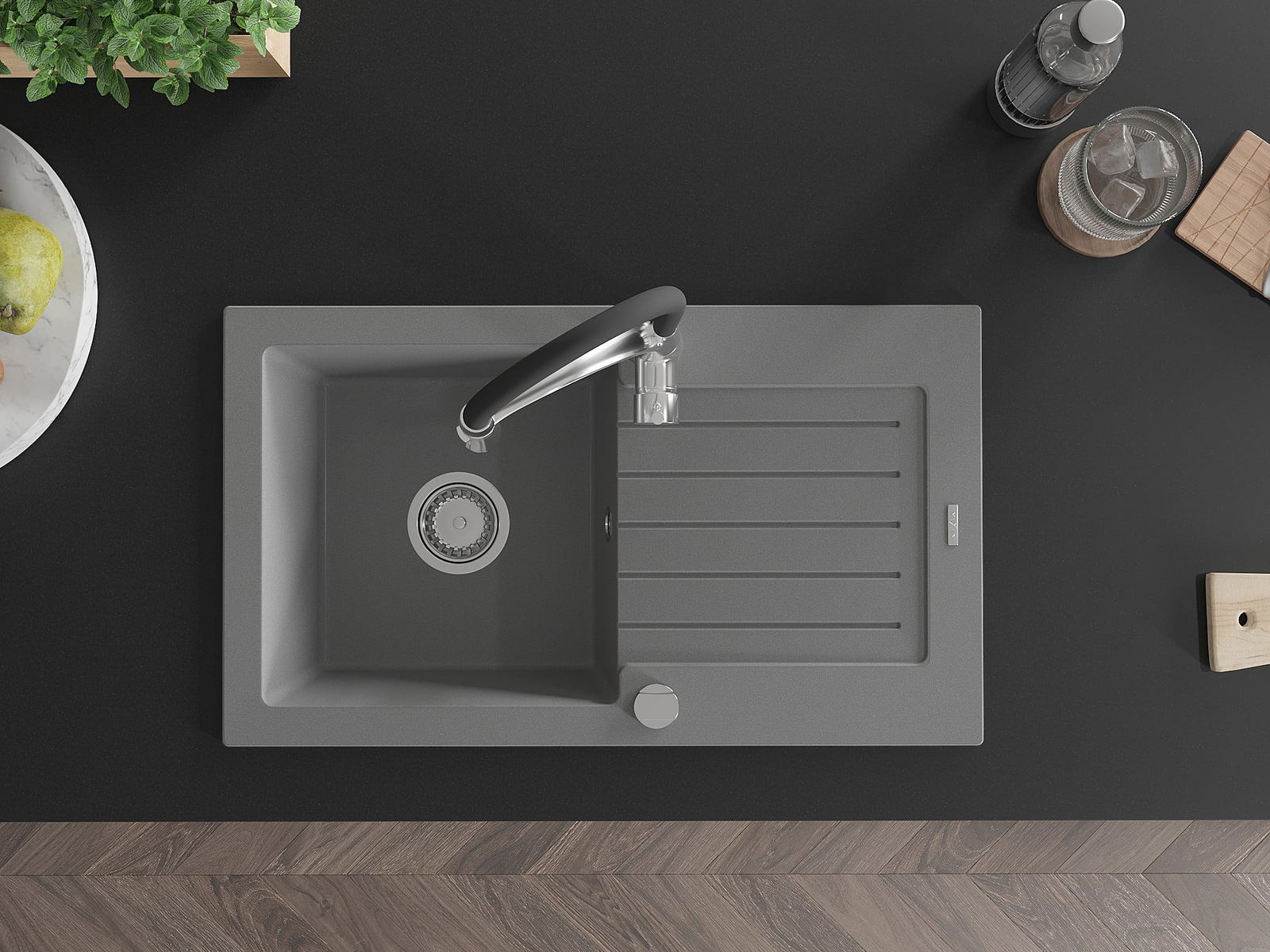 Mexen Pablo évier en granit 1 bac avec égouttoir et robinet de cuisine Aster, gris - 6510-71-73450-07