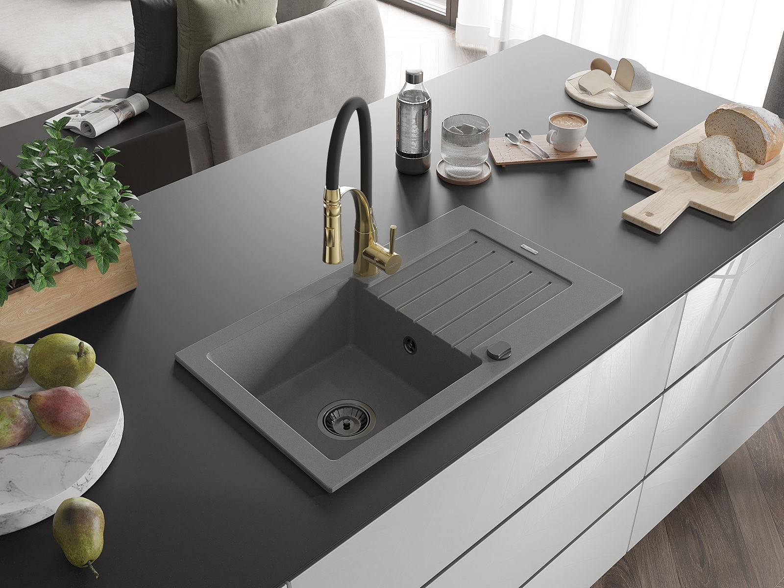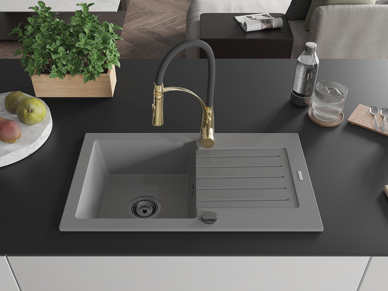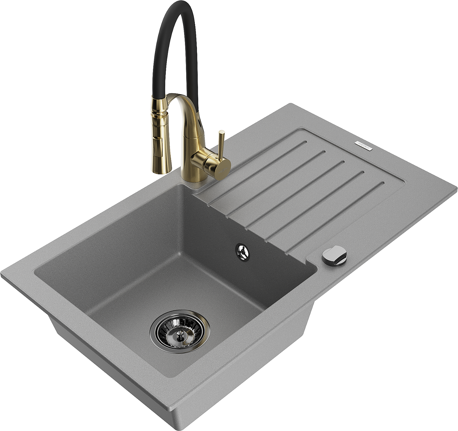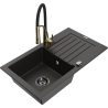 Mexen Pablo évier en granit 1 bac avec égouttoir et robinet de cuisine Aster, gris - 6510-71-73450-57-B