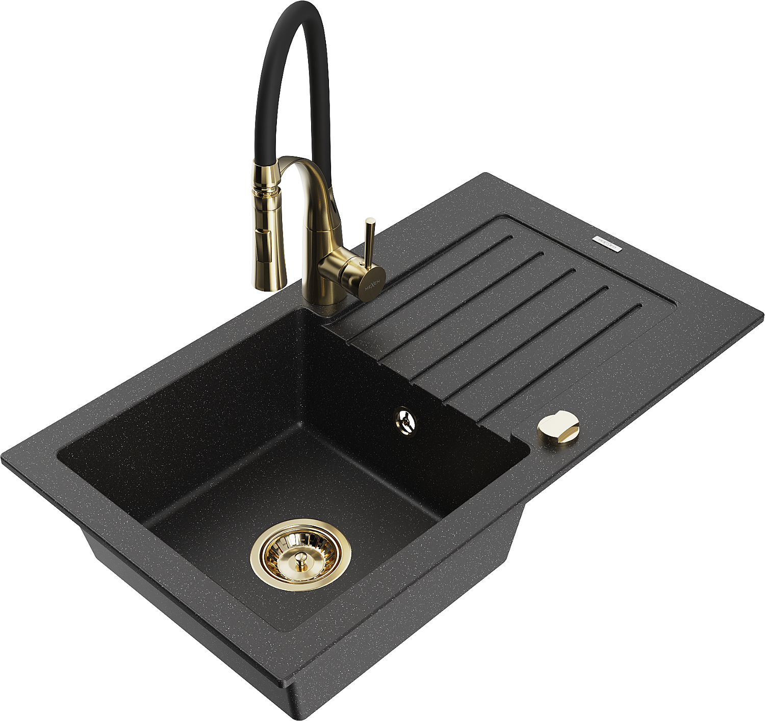 Mexen Pablo évier en granit 1 bac avec égouttoir et robinet de cuisine Aster, noir/argenté métallisé - 6510-73-73450-57-G