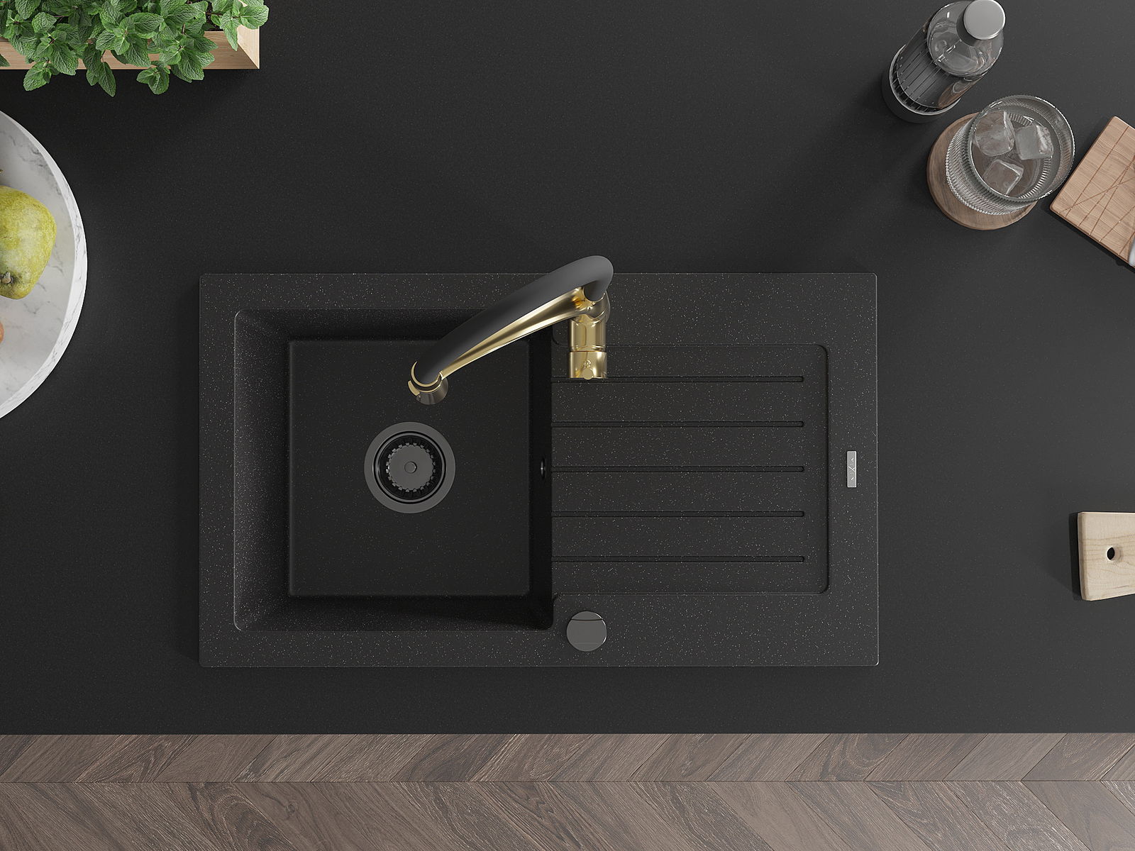 Mexen Pablo évier en granit 1 bac avec égouttoir et robinet de cuisine Aster, noir/argent métallisé - 6510-73-73450-57-B