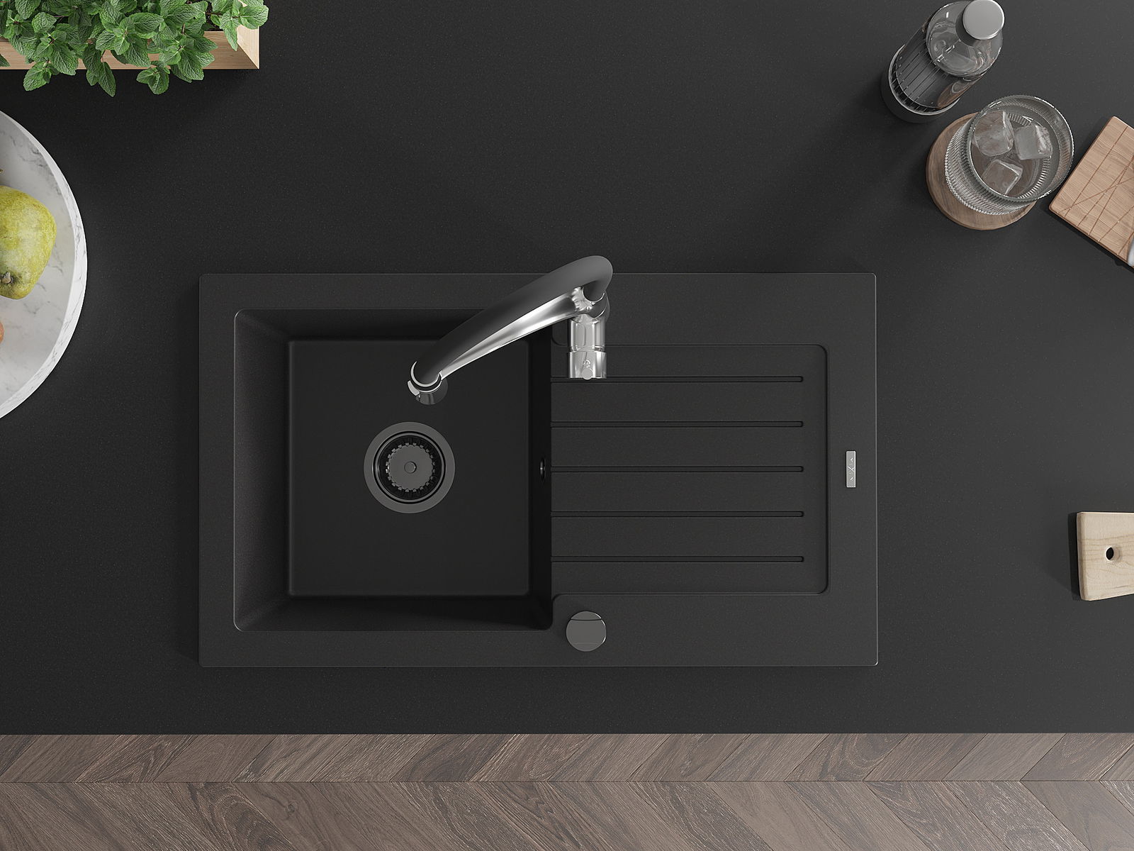 Mexen Pablo évier en granit 1 bac avec égouttoir et robinet de cuisine Aster, noir - 6510-77-73450-07-B