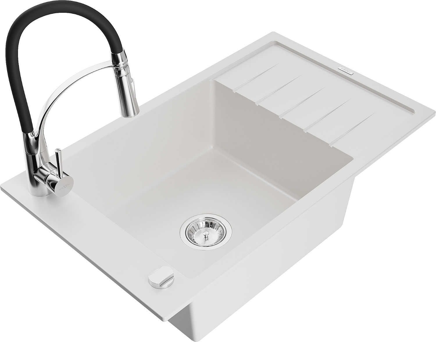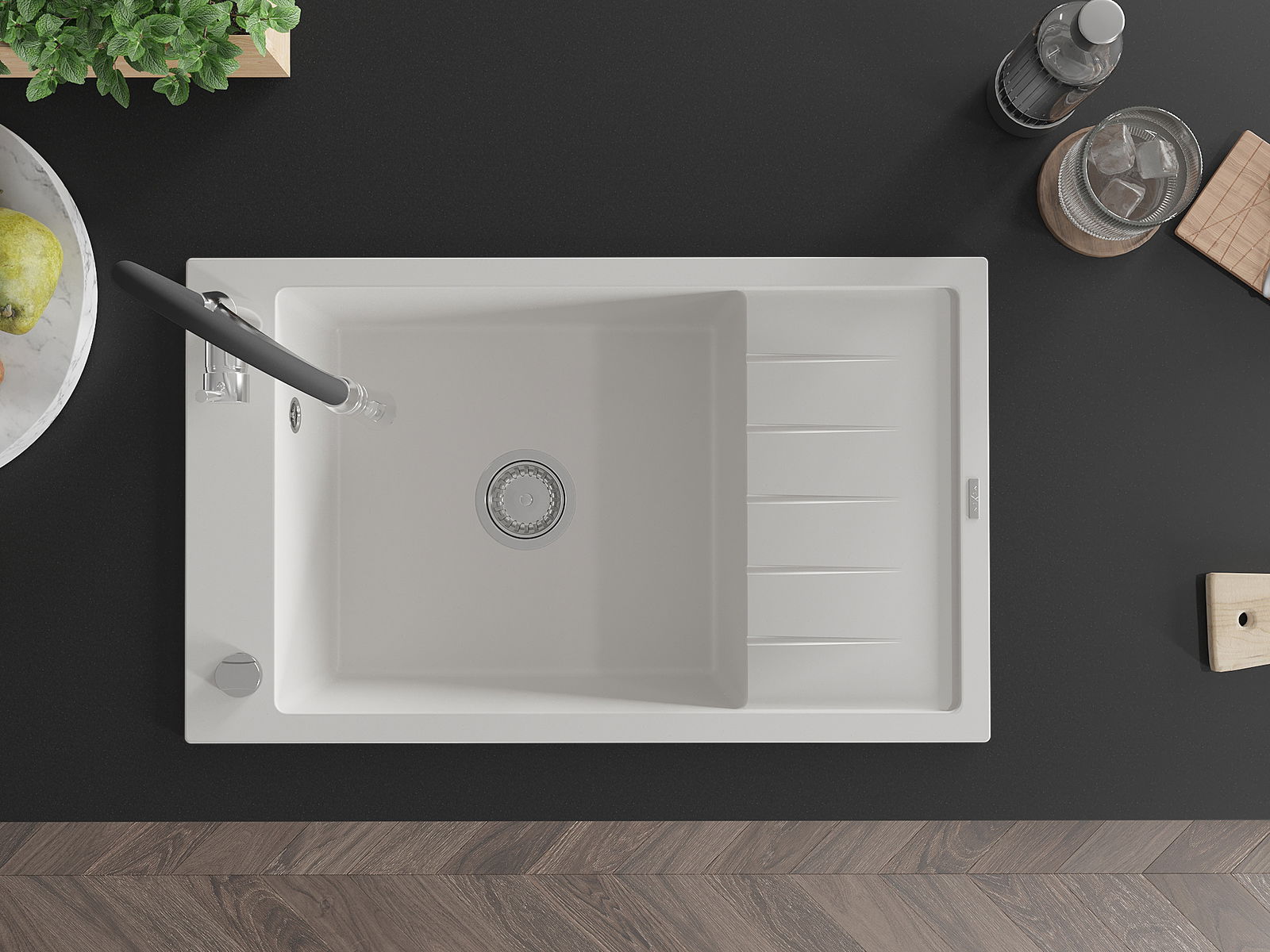 Mexen Elias évier en granit 1 bac avec égouttoir et robinet de cuisine Aster, blanc - 6511-20-73450-07