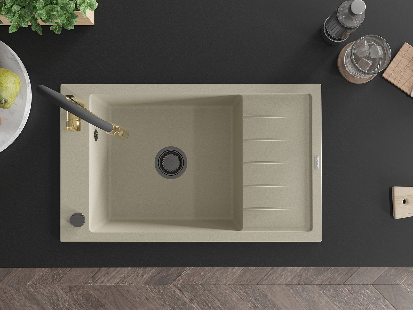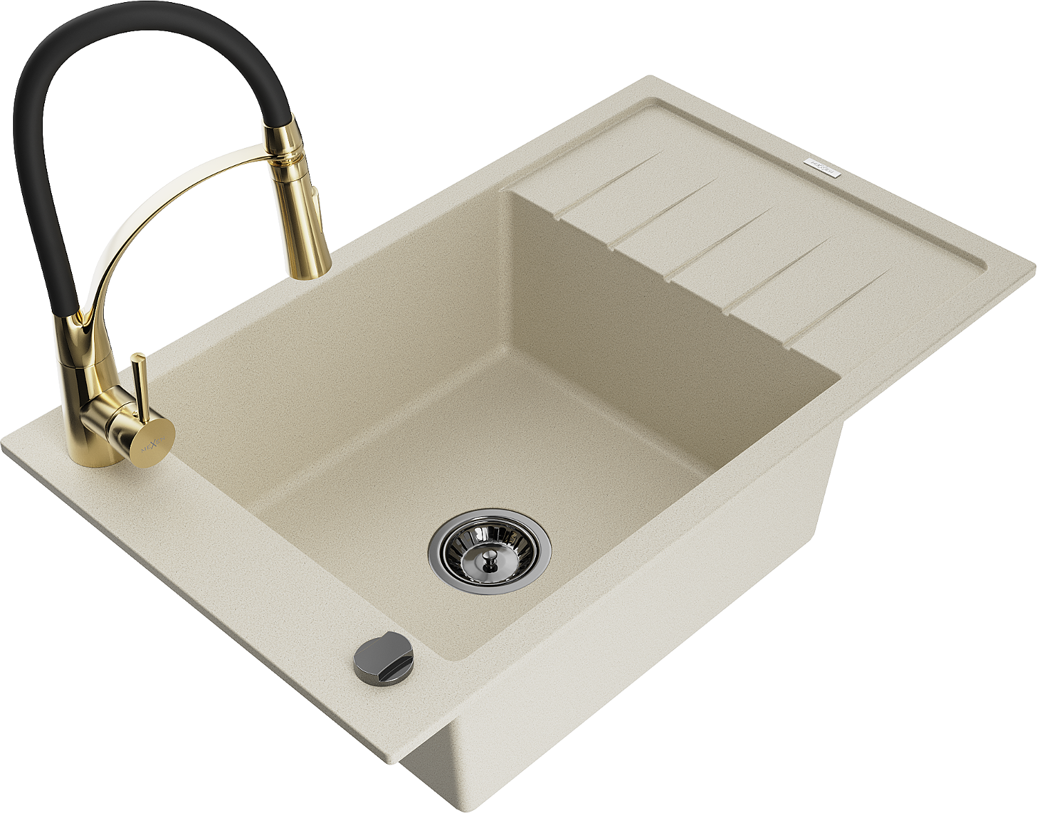 Mexen Elias évier en granit 1 bac avec égouttoir et robinet de cuisine Aster, beige - 6511-69-73450-57-B