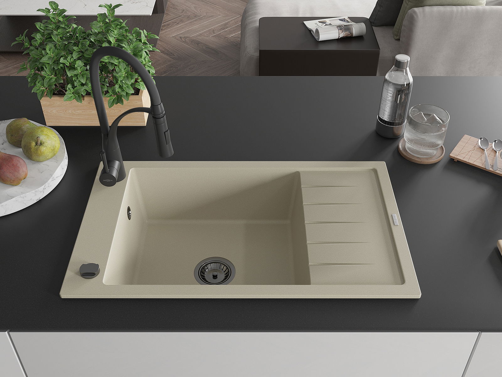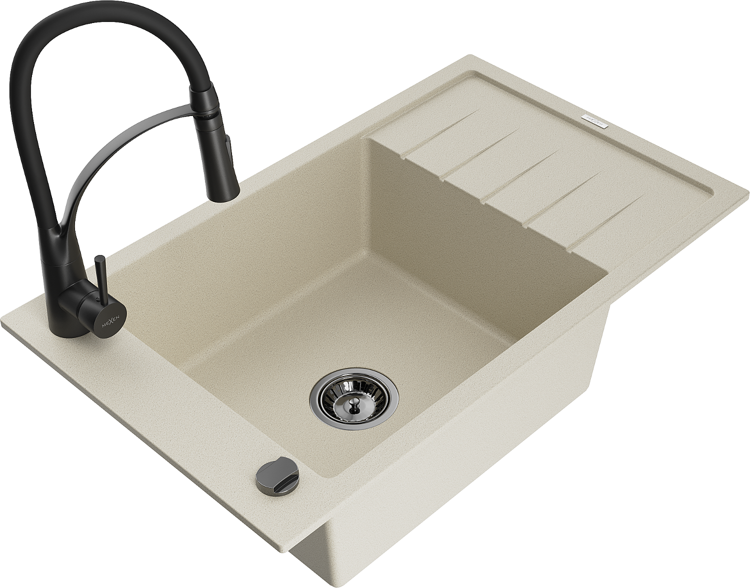 Mexen Elias évier en granit 1 bac avec égouttoir et robinet de cuisine Aster, beige - 6511-69-73450-70-B