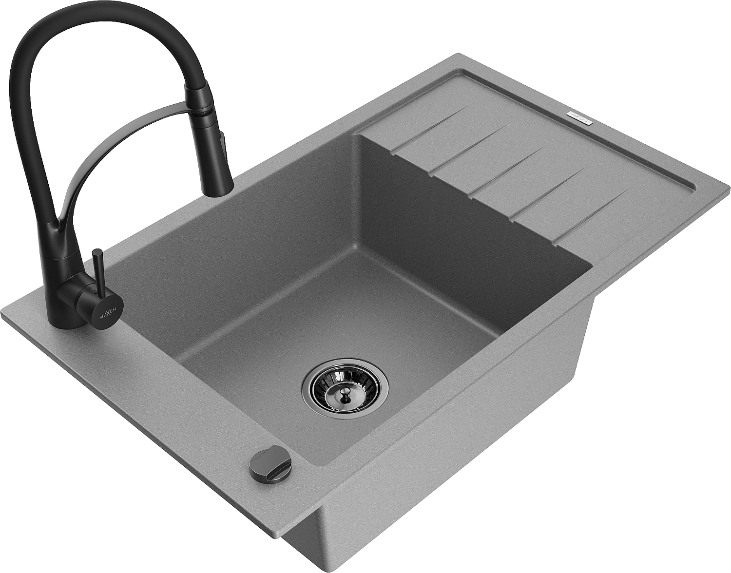 Mexen Elias évier en granit 1 bac avec égouttoir et robinet de cuisine Aster, gris - 6511-71-73450-70-B