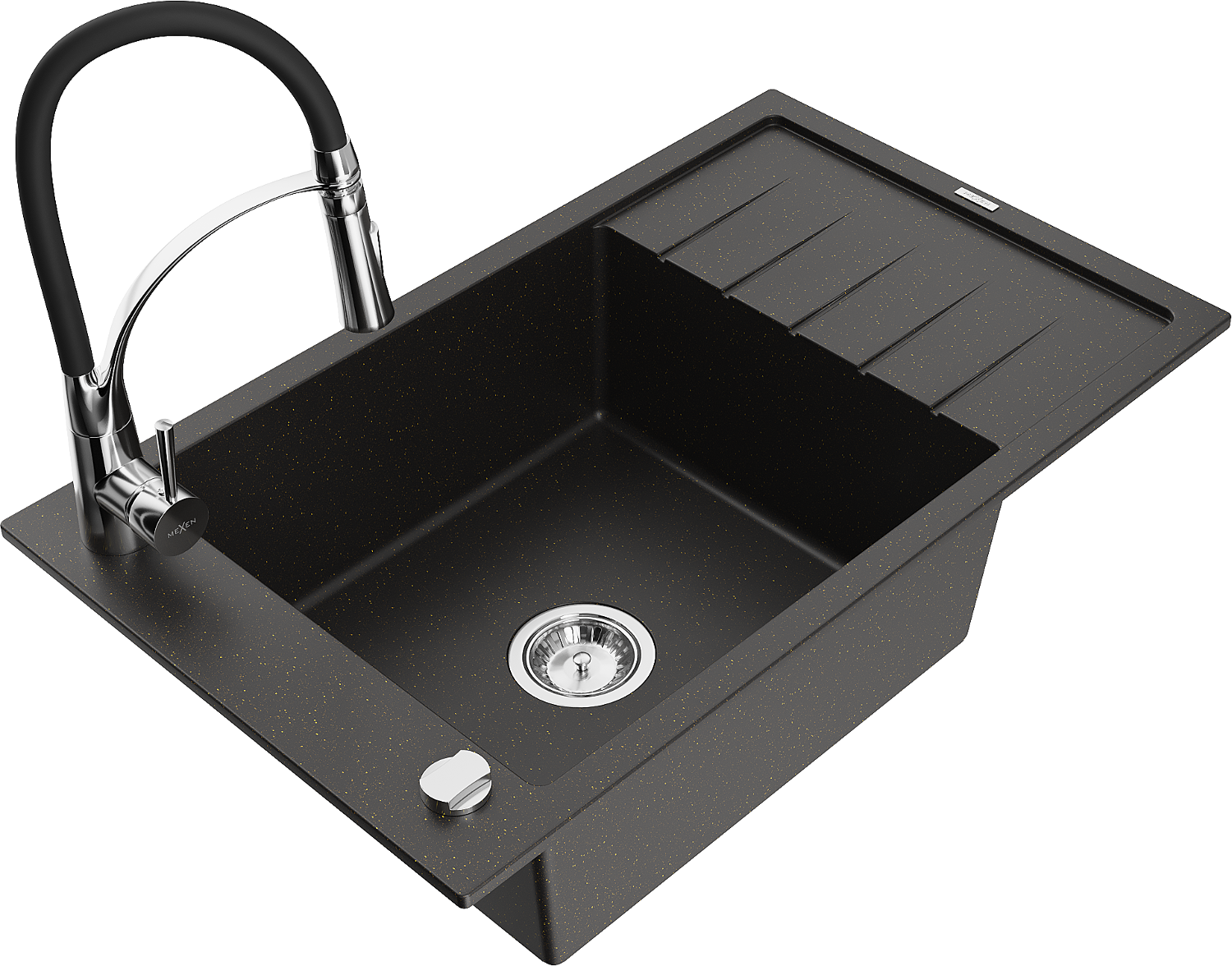 Mexen Elias évier en granit 1 bac avec égouttoir et robinet de cuisine Aster, noir/doré métallisé - 6511-75-73450-70