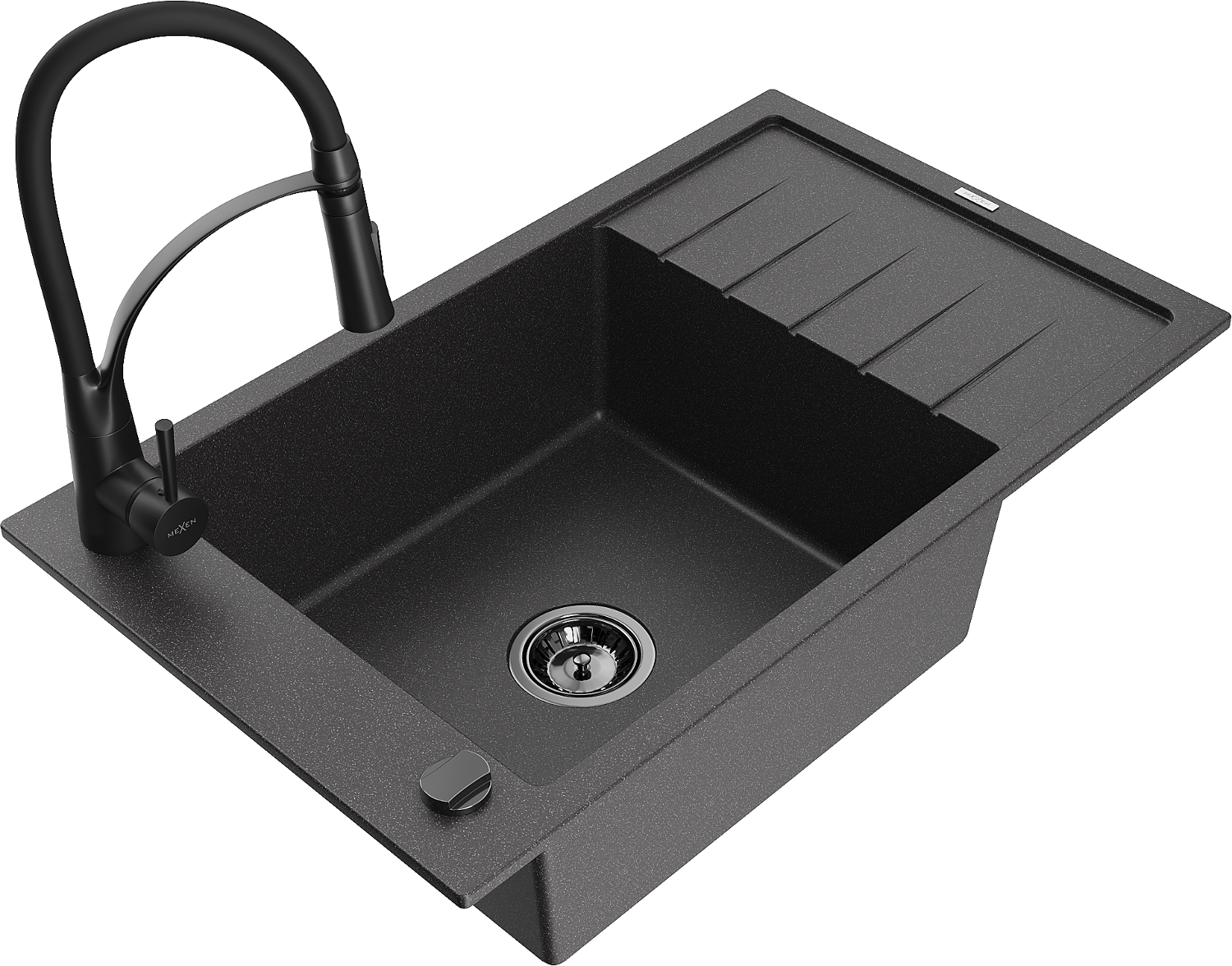 Mexen Elias évier en granit 1 bac avec égouttoir et robinet de cuisine Aster, noir moucheté - 6511-76-73450-70-B