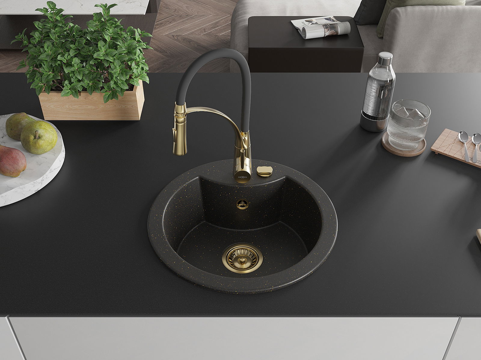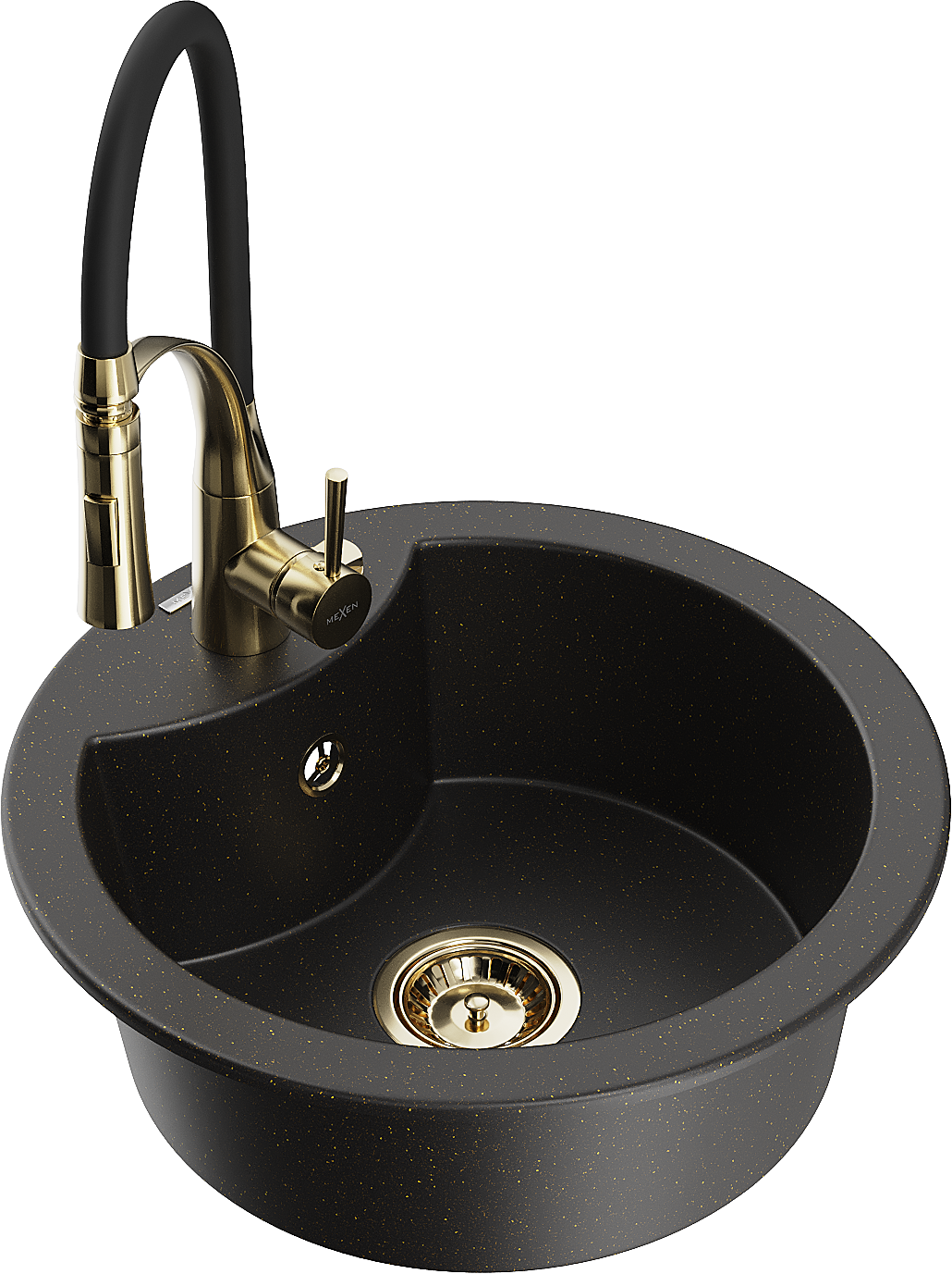 Mexen Diego évier en granit 1 bac avec robinet de cuisine Aster, noir/or métallisé - 6512-75-73450-57-G