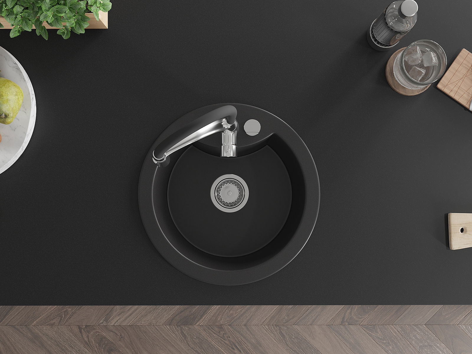 L'évier a un trou sous-meulé de 35 mm de diamètre à percer soi-même. Il peut être utilisé, entre autres, pour installer un distributeur de liquide, ce qui éliminera la présence de bouteilles en plastique dans la cuisine et lui donnera une finition élégante.