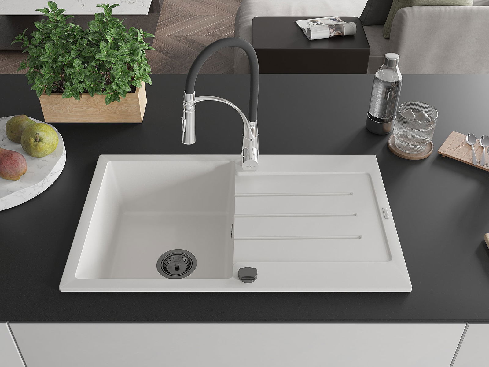 Mexen Bruno évier de cuisine en granit 1 bac avec égouttoir et robinet de cuisine Aster, blanc - 6513-20-73450-07-B