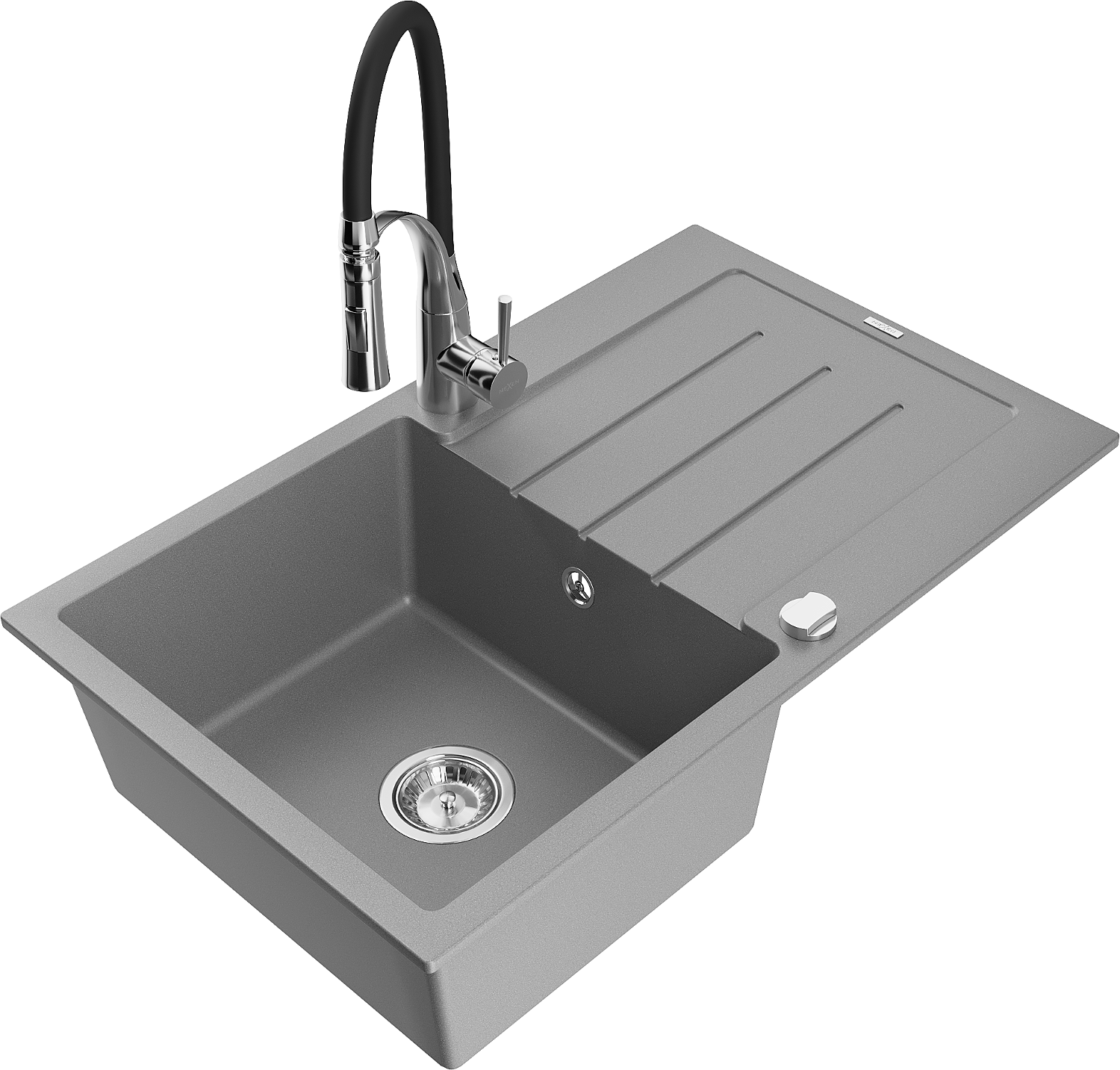 Mexen Bruno évier en granit 1 bac avec égouttoir et robinet de cuisine Aster, gris - 6513-71-73450-07