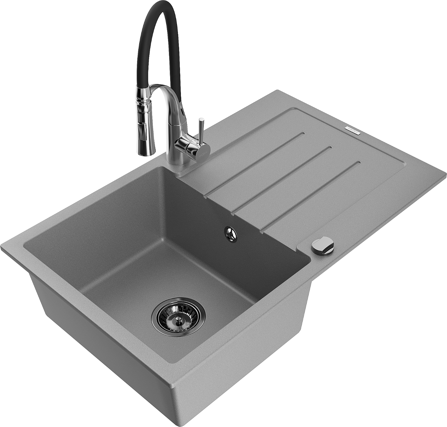 Mexen Bruno évier en granit 1 bac avec égouttoir et robinet de cuisine Aster, gris - 6513-71-73450-07-B