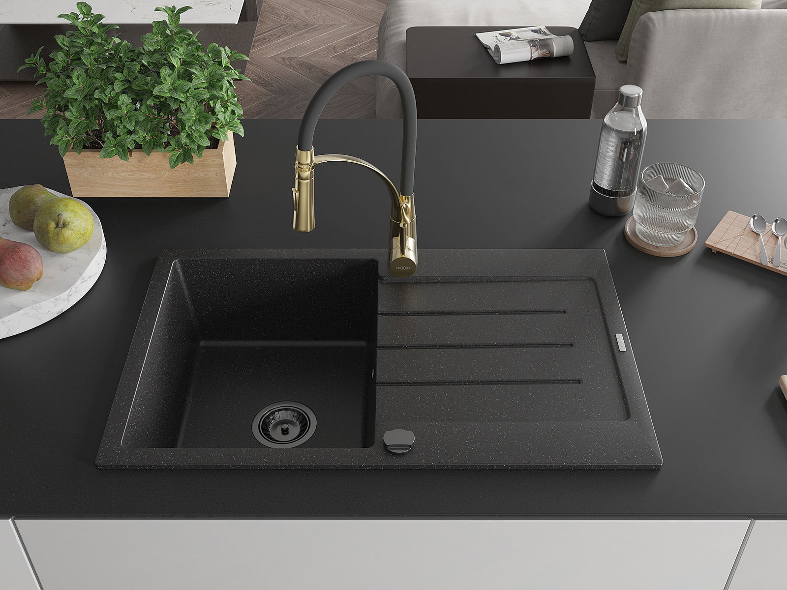 Mexen Bruno évier en granit 1 bac avec égouttoir et robinet de cuisine Aster, noir/métallisé argenté - 6513-73-73450-57-B