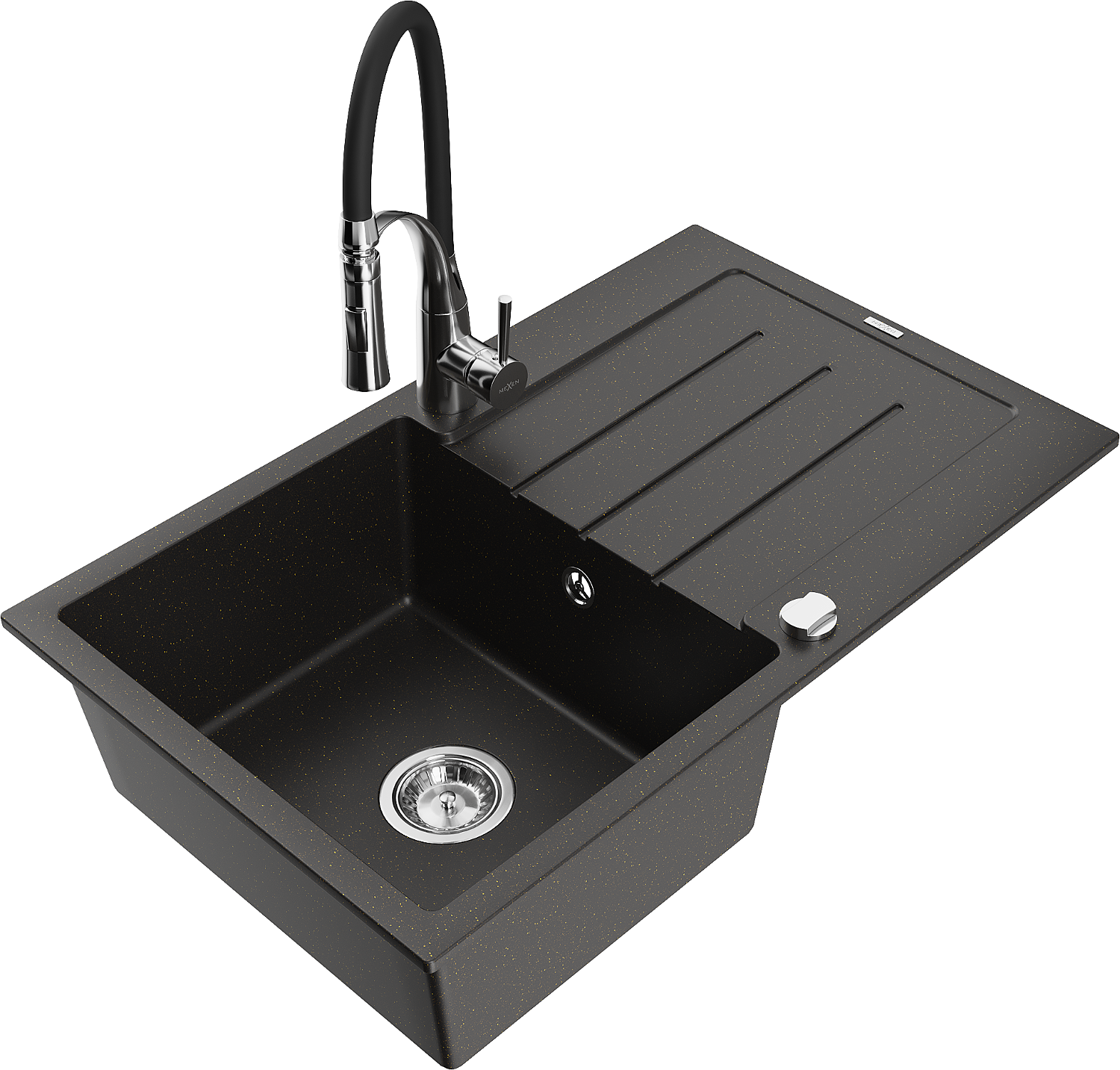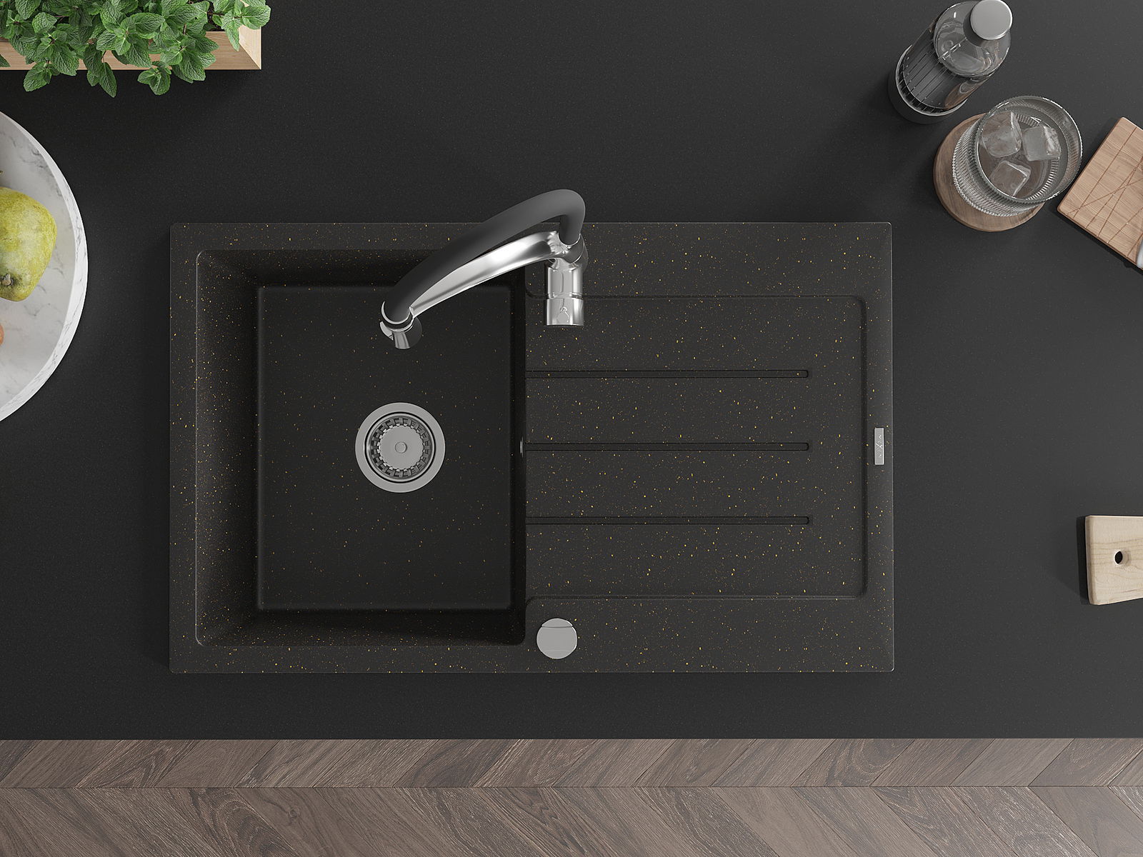 Mexen Bruno évier en granit à 1 bac avec égouttoir et robinet de cuisine Aster, noir/or métallique - 6513-75-73450-07