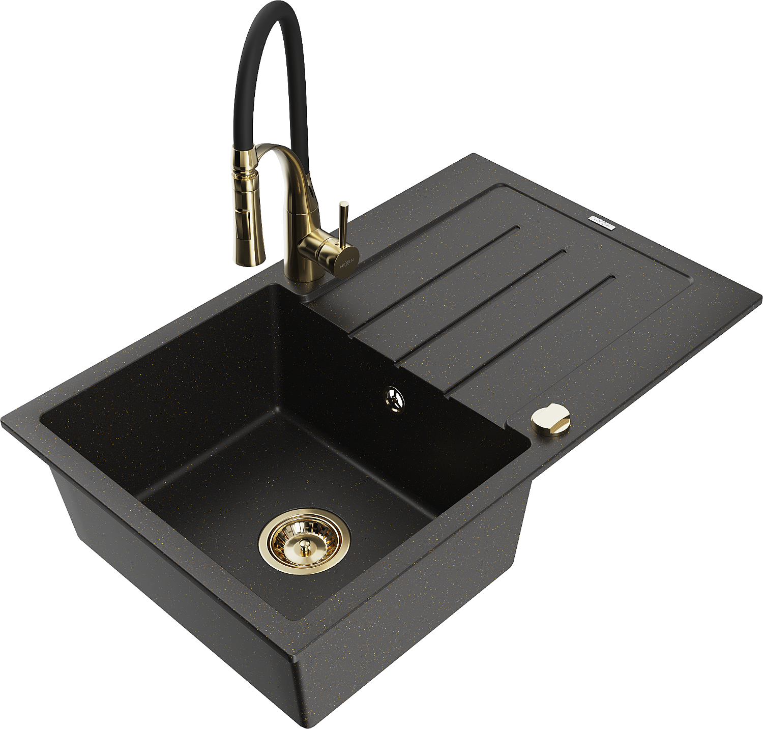 Mexen Bruno évier en granit 1 bac avec égouttoir et robinet de cuisine Aster, noir/or métallique - 6513-75-73450-57-G