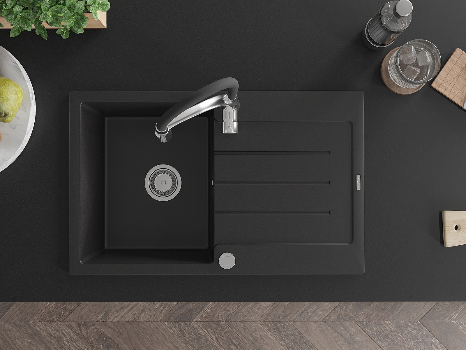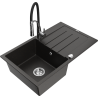 Mexen Bruno évier en granit 1 bac avec égouttoir et robinet de cuisine Aster, noir - 6513-77-73450-07