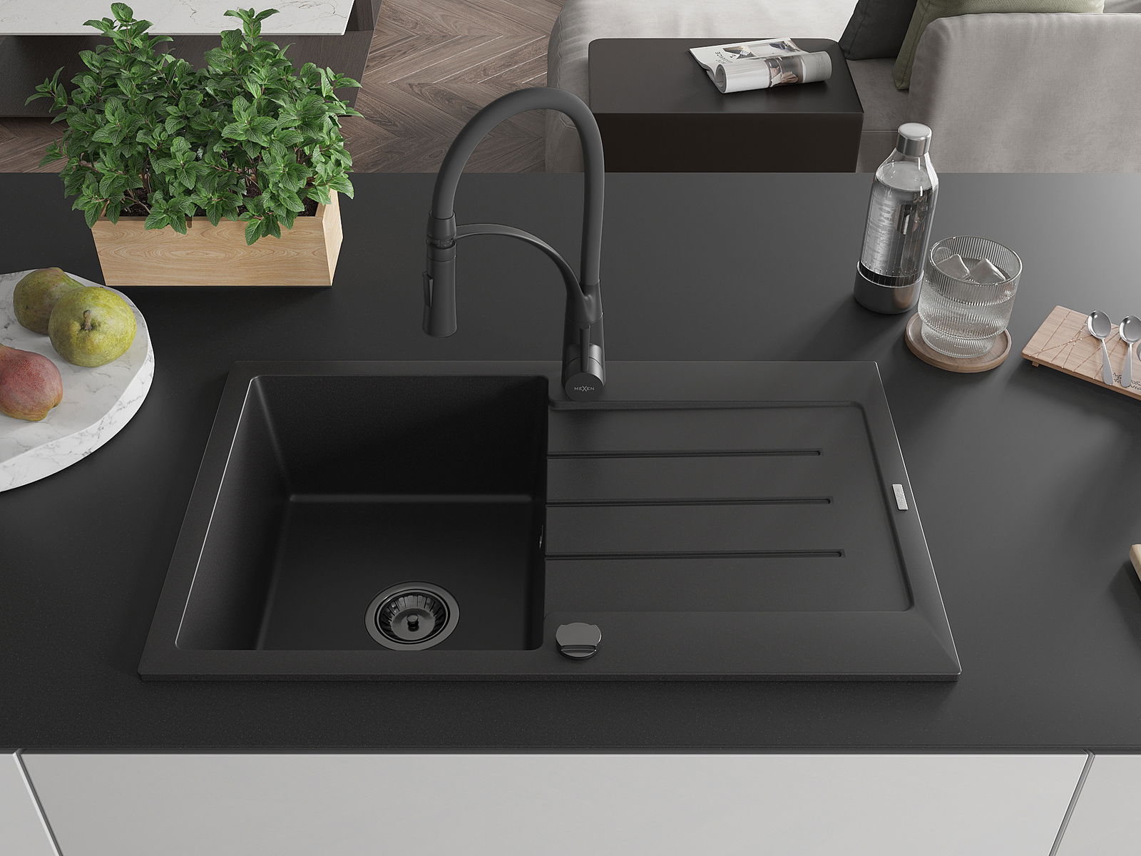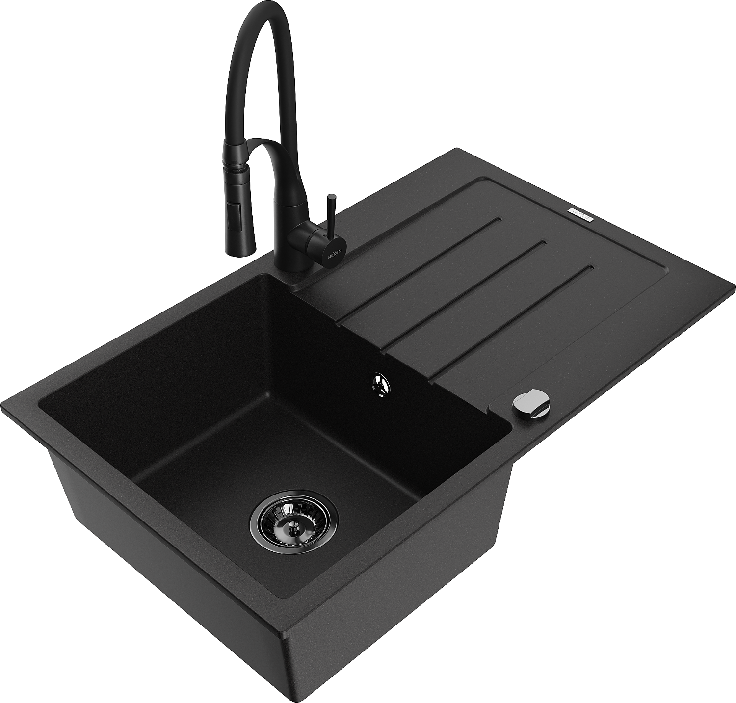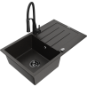 Mexen Bruno évier en granit à 1 bac avec égouttoir et robinet de cuisine Aster, noir - 6513-77-73450-70-B